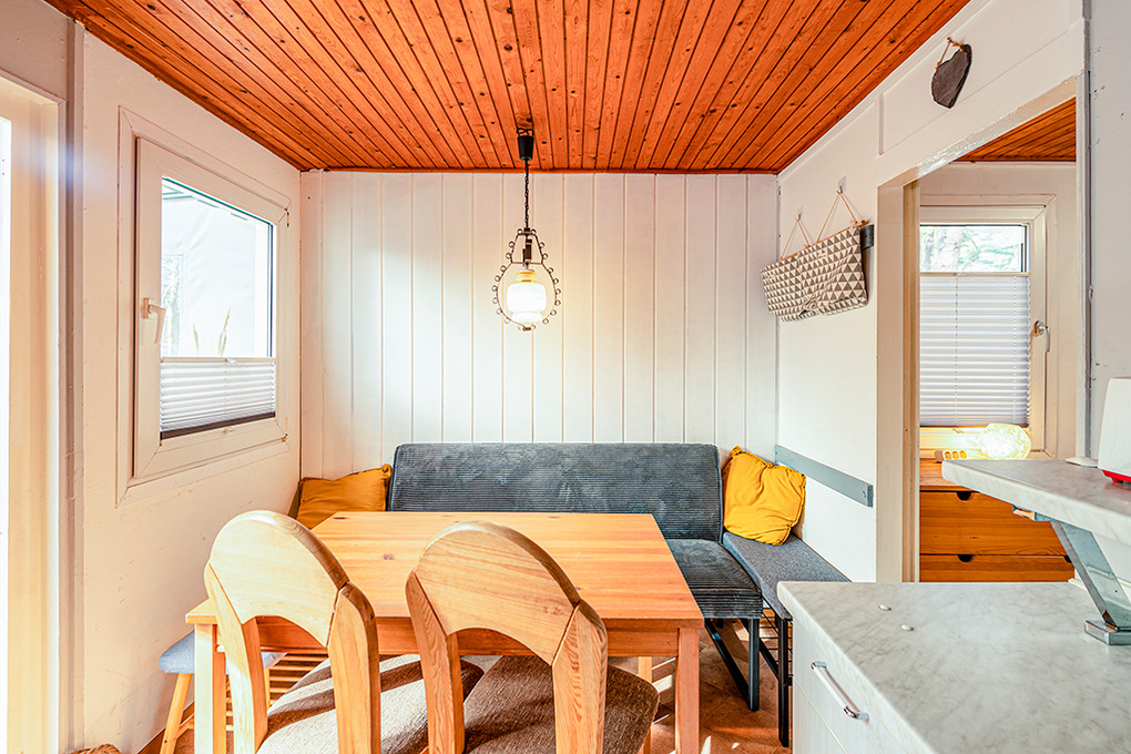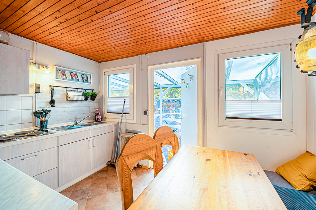 Haus: Holzvertäfelter Bungalow mit 2 Haushälften. Ansprechende Einrichtung. Nichtraucherhaus. Gasheizung. Überdachte Terrasse mit Sitzmöbeln, Grill. 1 Pkw-Stellplatz am Haus.