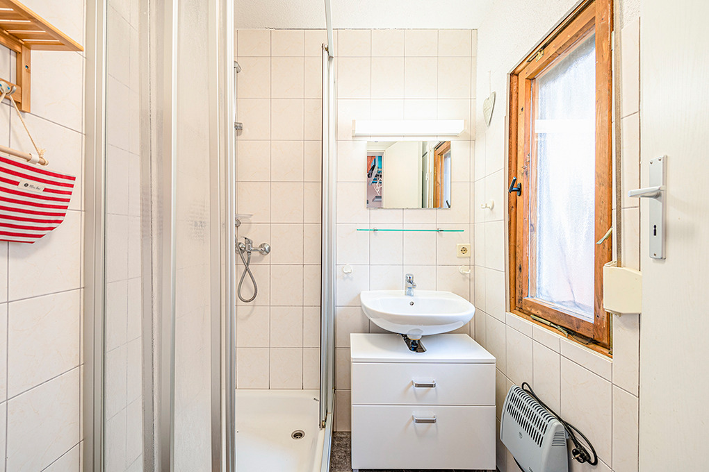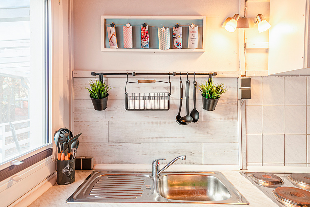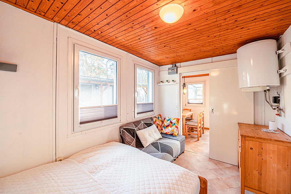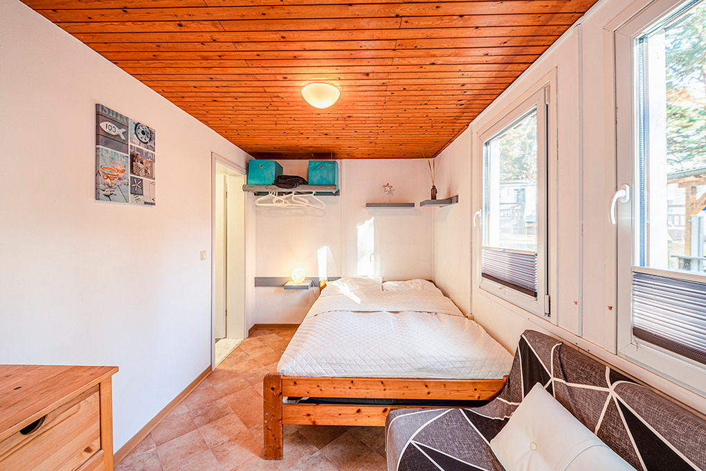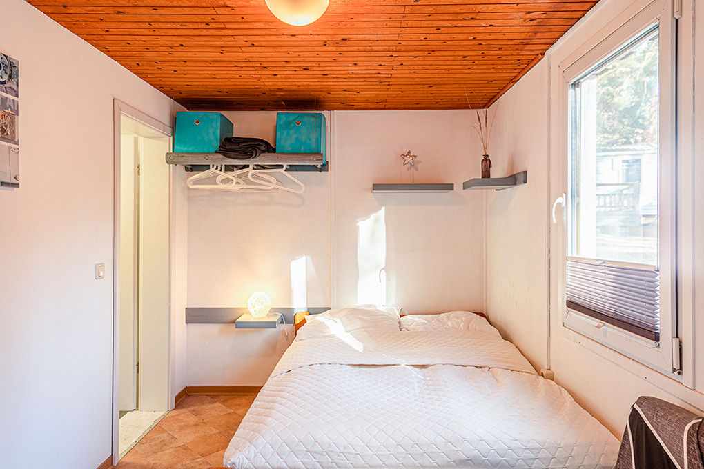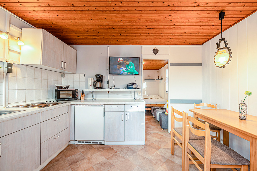 D 93.108 Bungalow 2 Pers.: 2-Zimmer-Haushälfte mit 25 qm Wohnfläche. Gemütliche Wohnküche mit Essecke, Sat-TV. Küchenzeile (4 Pl. E-Herd, Mikrowelle). Doppelzimmer mit französischem Doppelbett (1,60 m x 2 m). Kleines Bad mit Dusche, WC.