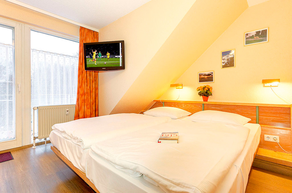 D 94.5 Wohnung 2-3 Pers.: 1 1/2-Zimmerwohnung mit 45 qm Wohnfläche, 2. Etage. Gemütliche Wohnküche mit Essecke, moderner Küchenzeile (Backofen, Mikrowelle), Süd-Balkon. Wohn-/Schlafraum mit Doppelbett, Couchgarnitur (Ausziehcouch 1 Pers.), Sat-TV, Stereoanlage, Balkon. Bad/WC.