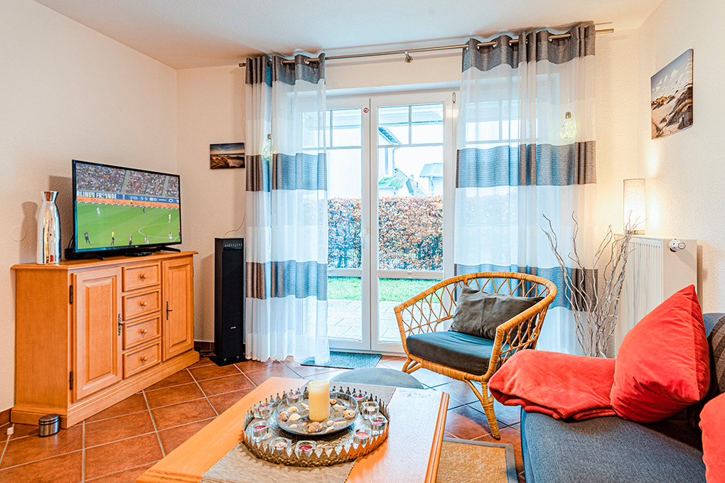 D 98.12 Wohnung 2-4 Pers.: Freundliche 2-Zimmerwohnung mit 45 qm Wohnfläche, Parterre. Flur mit Garderobe. Heller Wohn-/Essraum mit Couchgarnitur (Schlafcouch 2 Pers.), Sat-TV, CD-Radio, Esstisch, Küchenzeile (Backofen, Spülmaschine). Doppelzimmer mit Sat-TV. Bad/WC. Terrasse mit Sitzmöbeln. Kleiner Garten.