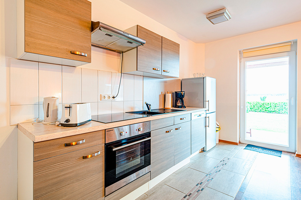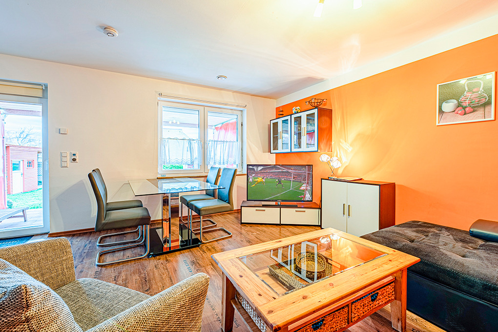 D 100.52 Wohnung 2-6 Pers.: 3-Zimmerwohnung mit 60 qm Wohnfläche, Parterre, Wasserblick. Wohn-/Essraum mit Couchgarnitur (Ausziehcouch 2 Pers.), Sat-TV, Esstisch, Küchenzeile (Backofen, Spülmaschine). Doppelzimmer, dahinter weiteres Doppelzimmer. 2 Bäder mit Dusche/WC. Überdachte Terrasse mit Sitzmöbeln. Umzäunter Garten mit Grill.