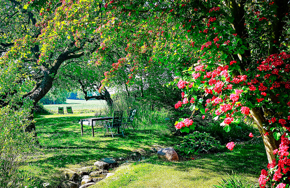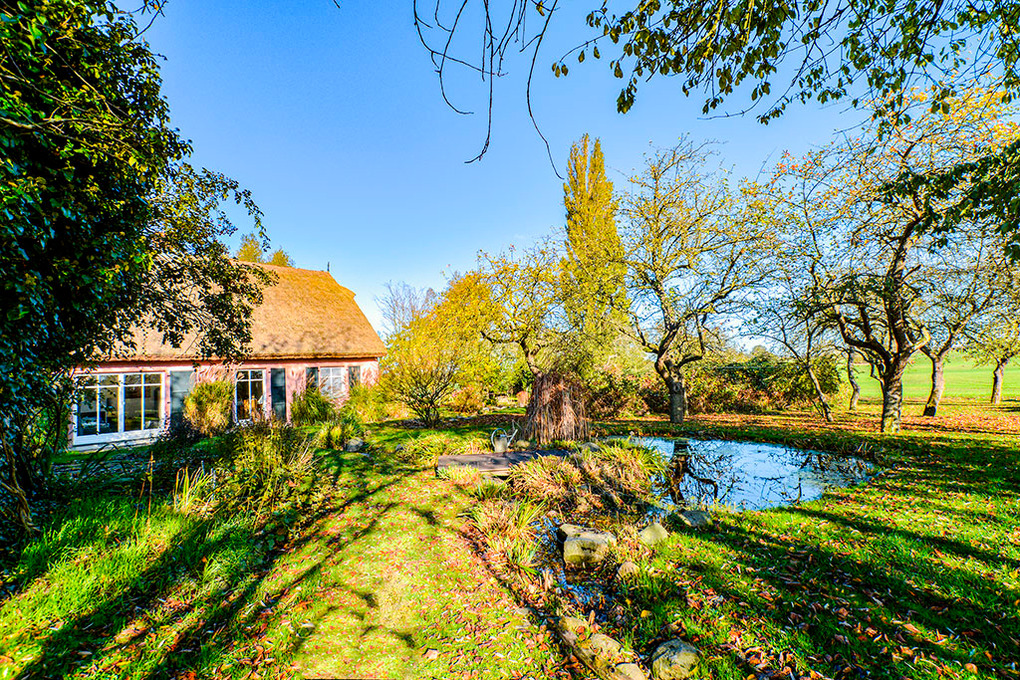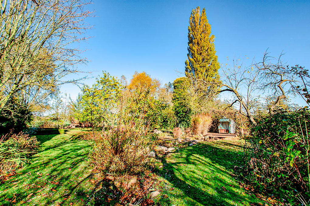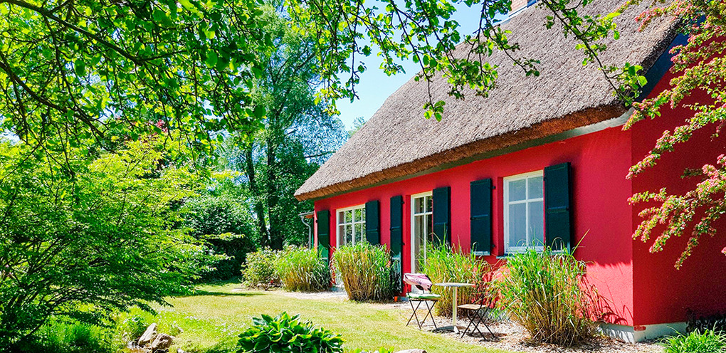 Haus: Alleinstehendes Reetdachhaus auf einem herrlich angelegten Gartengrundstück. 3 Fewos mit geschmackvoller Einrichtung. Kostenloser Internetzugang über W-Lan. Fußbodenheizung. Nichtraucherwohnungen. Jede Fewo mit eigener Terrasse, Grill. Großer Garten mit altem Baumbestand, kleinen Teichen, Sonnendeck mit Strandkorb. Fahrradschuppen. 2 Parkplätze pro Wohnung am Haus.
