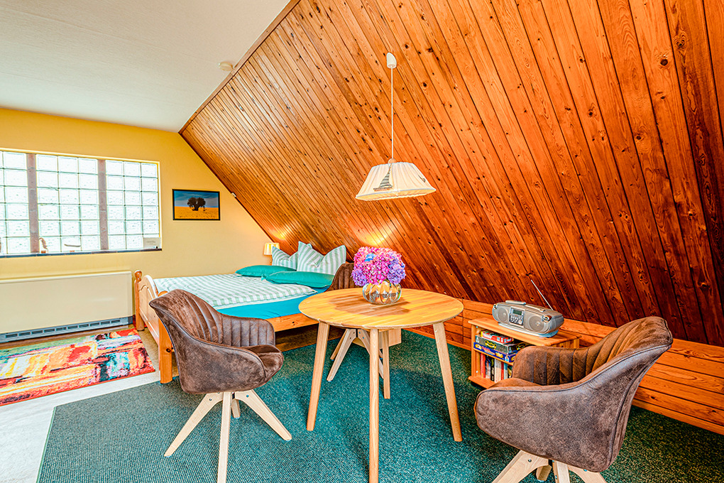 D 108.16 Ferienhaus 2 Pers.: 1-Zimmerhaus mit ca. 40 qm Wohnfläche, 1 Etage. Großzügiger Wohn-/Schlafraum mit Sat-TV, Radio-CD, Esstisch, Pantry-Küche (2 Pl. E-Herd), Doppelbett. Separates WC. Zusätzliches Bad/WC im Parterre.