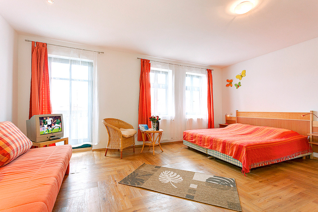 1. Etage: 6 Doppelzimmer teilweise mit Sat-TV, eines mit Bad (Du, Wb, WC). Ein 4-Bettzimmer mit Doppelbett, Schlafcouch (2 Pers.). 3 Bäder, jeweils mit Du, Wb, WC.