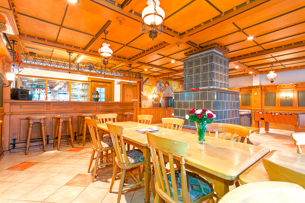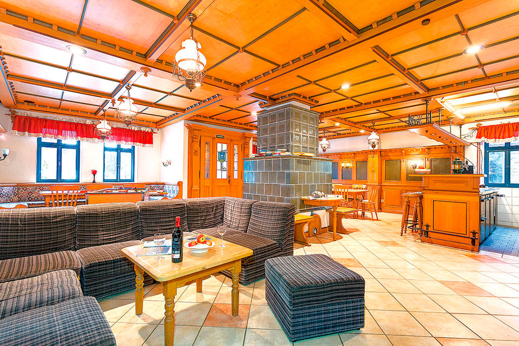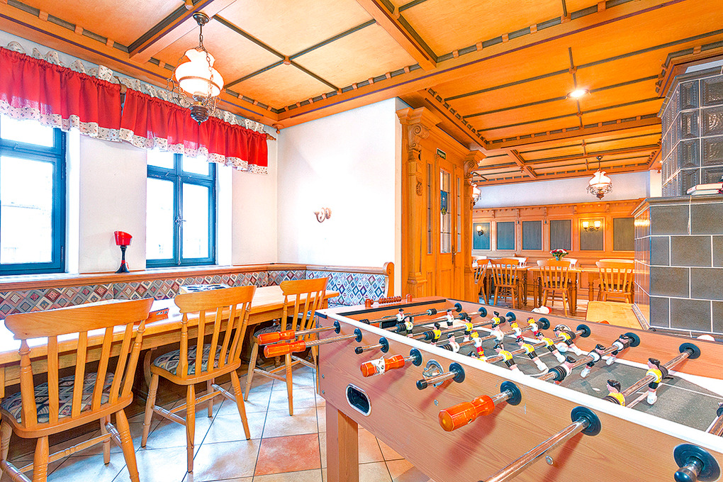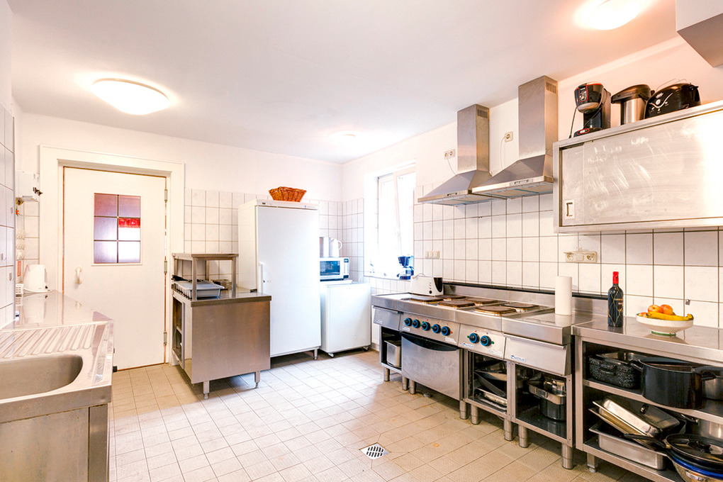 Parterre: Große, gemütliche Gaststube mit Esstischen, Theke, Tischfußball, großem Flachbild-TV. Professionelle Gastronomie-Küche mit großem E-Herd, Backofen, Tiefkühltruhe, Spülmaschine. 2 separate WC.