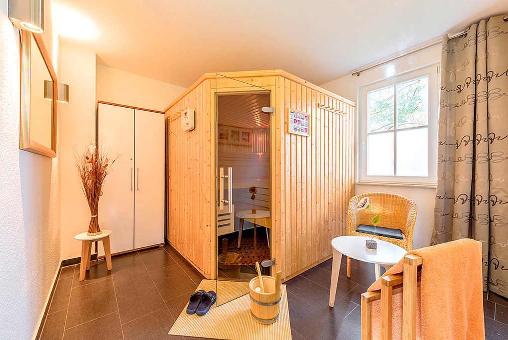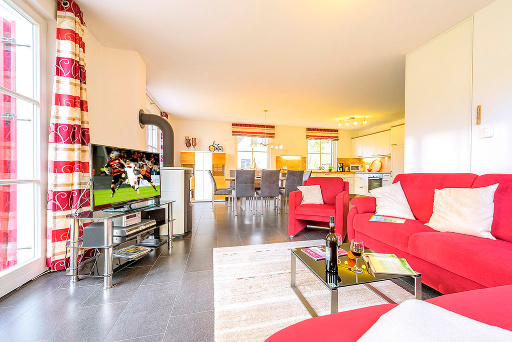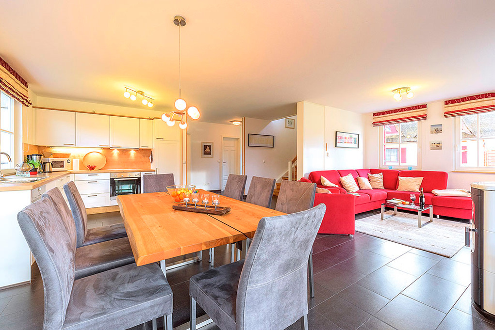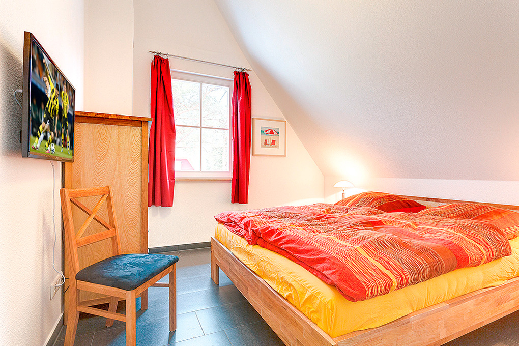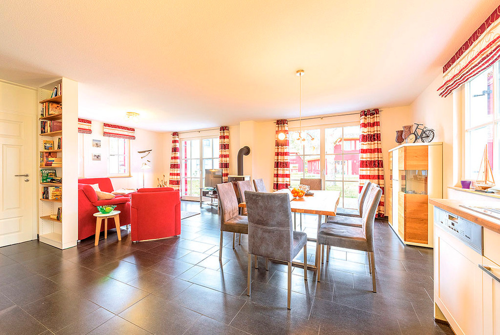 D 120.1 Ferienhaus 2-8 Pers.: Komfortables 6-Zimmerhaus mit 120 qm Wohnfläche über 2 Etagen. Parterre: Gemütlicher Wohn-/Essraum mit Kaminofen, Couchgarnitur, Sat-TV, DVD, Radio-CD, Esstisch, sehr gut ausgestatteter Einbauküche (Backofen, Mikrowelle, Spülmaschine). Schöner Saunaraum. Bad/WC. Abstellraum mit Waschmaschine, Trockner. 1. Etage: Drei Doppelzimmer, davon eins mit Sat-TV. 2-Bettzimmer mit Sat-TV. Bad/WC.