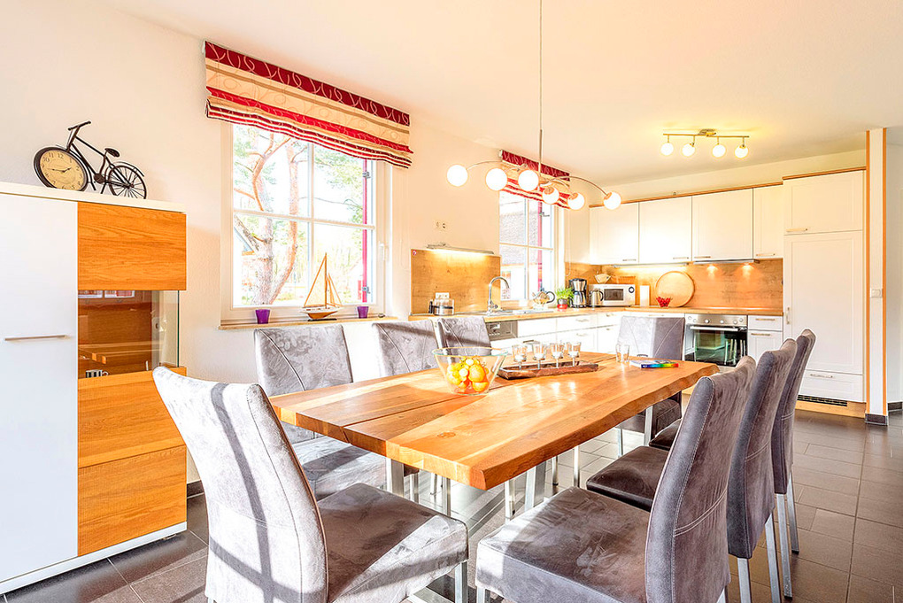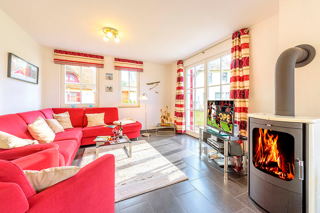 Haus: Exklusives Reetdachhaus mit Sauna und Kaminofen, 2012 neu erbaut. Nichtraucherhaus. Gehobene Ausstattung mit moderner, geschmackvoller Einrichtung. Kostenloser Internetanschluss (W-Lan). Fußbodenheizung. Ladestation für E-Autos vorhanden (Gebühr). Terrasse mit Sitzmöbeln, Strandkorb, Grill. 2 Pkw-Stellplätze am Haus.