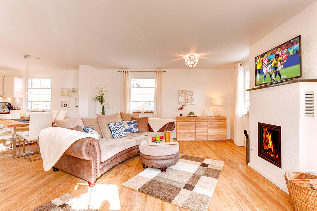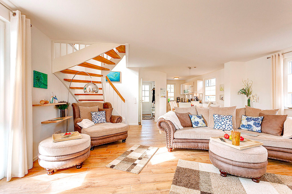 D 120.10 Ferienhaus 2-4 Pers.: Komfortables 3-Zimmerhaus mit ca. 95 qm Wohnfläche über 2 Etagen. Parterre: Gemütlicher Wohn-/Essraum mit Kamin, Couchgarnitur, Sat-TV, Esstisch, gut ausgestatteter Einbauküche (Backofen, Mikrowelle, Spülmaschine). Abstellraum mit Waschmaschine/Trockner. Bad: Du, Wb, WC. 1. Etage: Zwei Doppelzimmer mit Sat-TV. Bad: Du, Bw, Wb, WC.