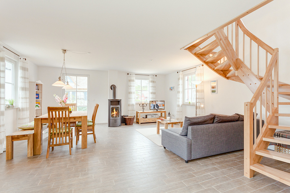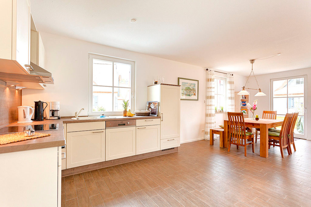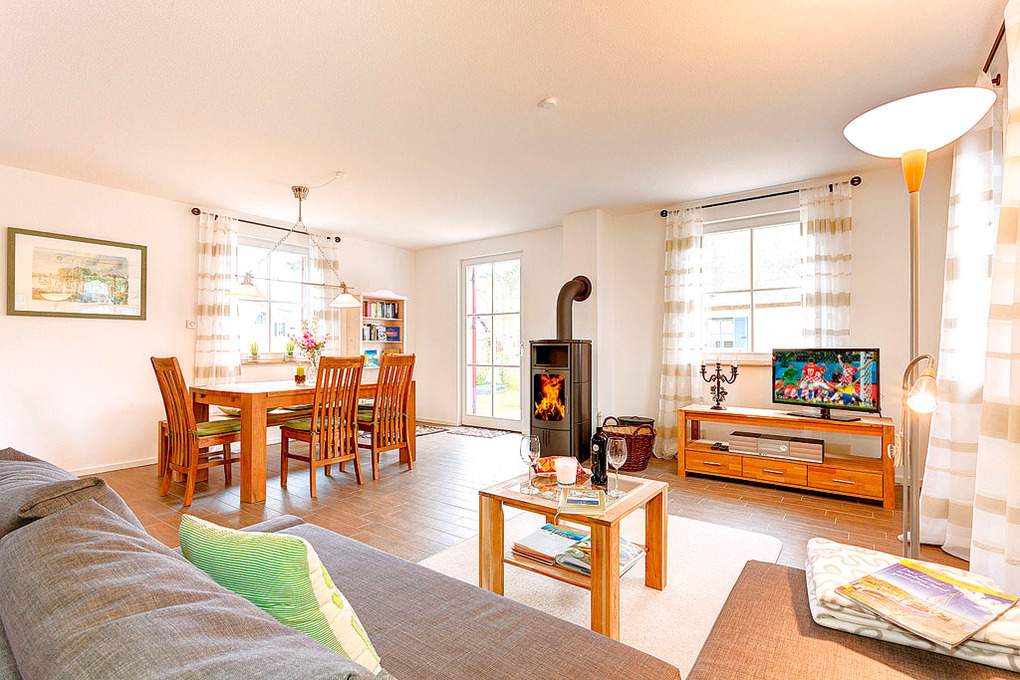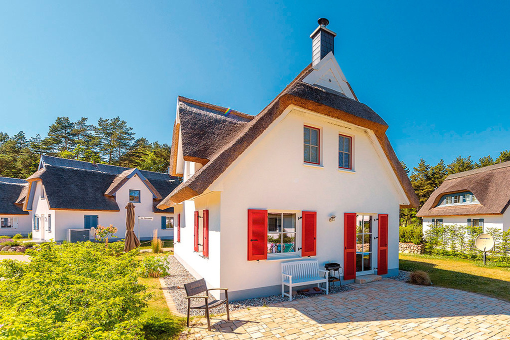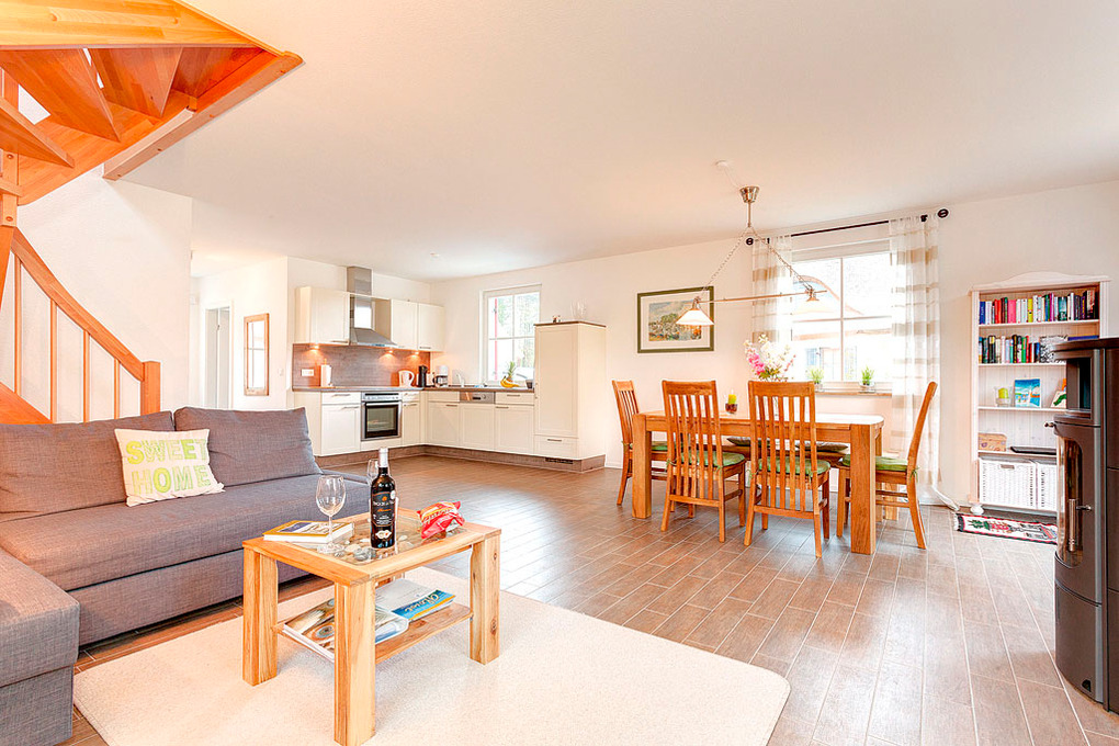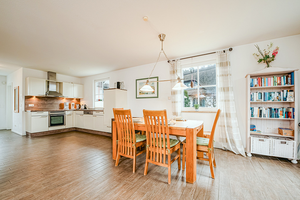 Haus: Komfortables Reetdachhaus mit Sauna und Kaminofen, 2013 neu erbaut. Nichtraucherhaus. Gehobene Ausstattung mit moderner, geschmackvoller Einrichtung. Kleine Bibliothek im Wohnbereich. Kostenloser Internetzugang (W-Lan). Fußbodenheizung. Terrasse mit Sitzmöbeln, Sonnenliege, Grill. Garten mit Sandkasten (300 qm). 2 Pkw-Stellplätze am Haus.
