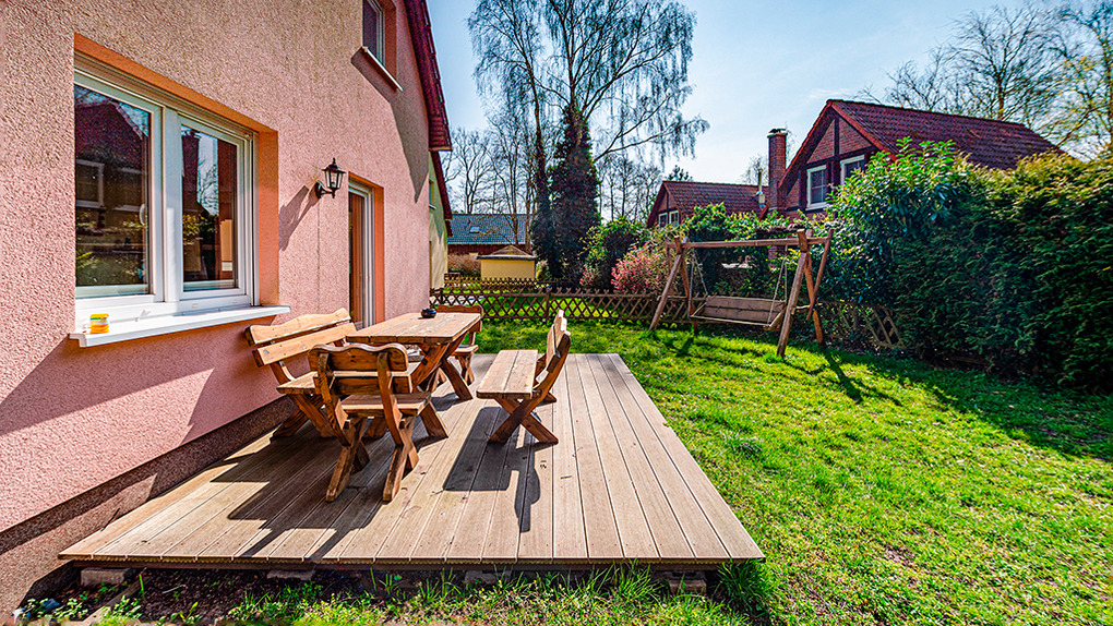 Haus: Schöne, kleine Ferienhausanlage am Rande eines Kiefernwaldes. Komfortables Haus mit Kaminofen und gehobener Ausstattung. E-Zentralheizung. Terrasse mit Sitzmöbeln, angrenzender Rasenfläche. 1 Pkw-Stellplatz vorhanden.
