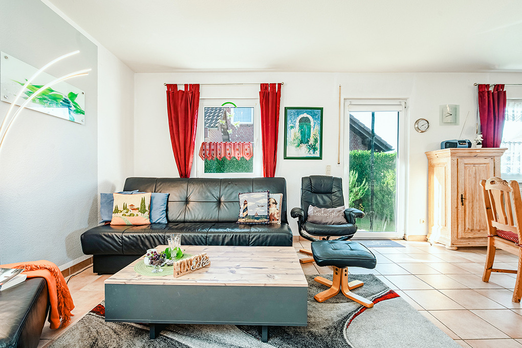 Haus: Schönes Ferienhaus auf einem 400 qm großen Grundstück. Freundliche Einrichtung. Kostenloser Internetzugang (W-Lan). Nichtraucherhaus. Zentralheizung. Terrasse mit Sitzmöbeln, Grill. Großer, umzäunter Garten. Fahrradschuppen. 1 Pkw-Stellplatz am Haus.