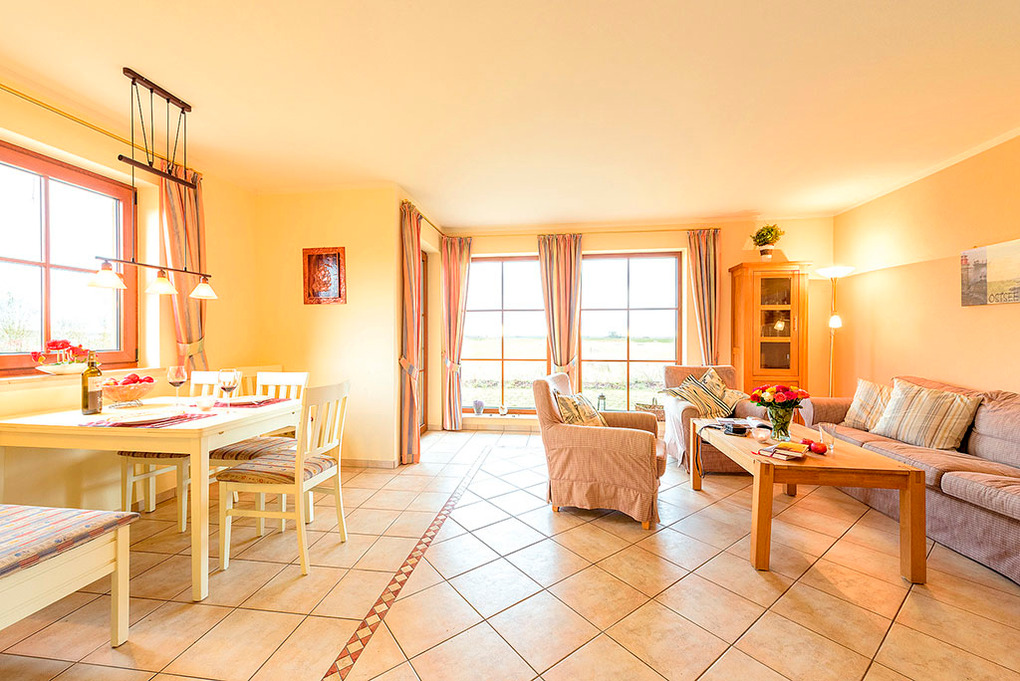 D 128.31A Ferienhaus 2-6 Pers.: 4-Zimmerhaushälfte mit ca. 95 qm Wohnfläche. Parterre: Großzügiger Wohn-/Essraum mit Kaminofen, Sitzgarnitur, Flachbild-Sat-TV, DVD, Radio-CD, Internetzugang (Wireless-Lan), Esstisch. Offene Küche mit Spülmaschine, Backofen, Mikrowelle. Bad: Sauna, Du, Wb, WC. 1. Etage: Zwei Doppelzimmer, davon eins mit Sat-TV. Bad: Du, Wb, WC, Waschmaschine, Trockner. 2. Etage mit Schrägen: 2-Bettzimmer.