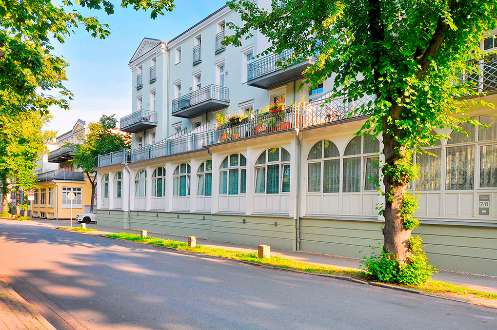 Haus: Aufwendig im Stile der Bäderarchitektur restauriertes Appartementhaus. Moderne Ferienwohnungen mit komfortabler Einrichtung. Alle Wohnungen mit Kabel-TV, Küchenzeile (Backofen, Mikrowelle, meist Spülmaschine), Abstellraum. Zentralheizung. Fast alle Fewos mit Balkon oder Wintergarten, überwiegend mit Blick in den Kurpark. Im Haus: Aufzug, Fahrradkeller, Münz-Waschmaschine/-Trockner. Öffentliches Parkhaus gegen Gebühr 150 m (Parkgebühr 50% reduziert).