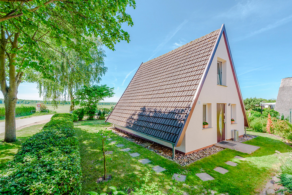 Haus: Schöne Finnhütte mit freundlicher Einrichtung. Gasheizung. Terrasse mit Sitzmöbeln. Gepflegter Garten mit Rasenfläche. 1 Pkw-Stellplatz.