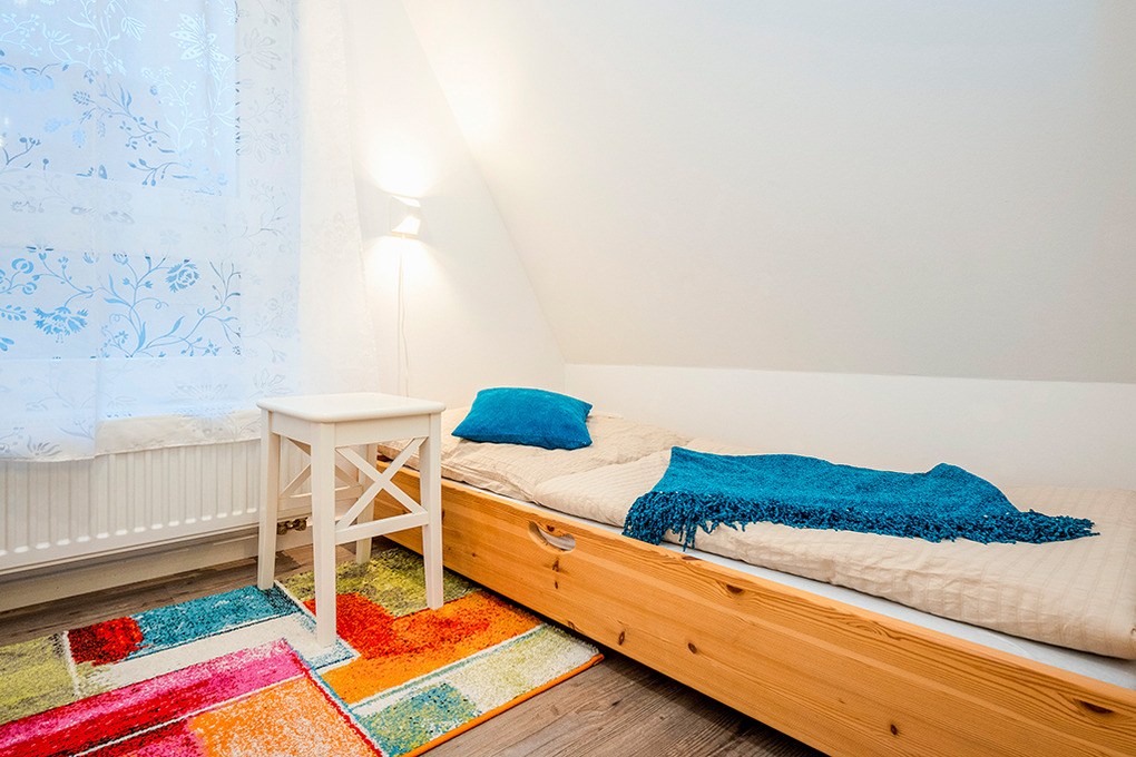 D 129.621 Finnhütte 2 Erw., 2 Kinder: 3 1/2-Zimmerhaus mit 45 qm Wohnfläche über 2 Etagen. Parterre: Gemütlicher Wohnraum mit Couchgarnitur, Sat-TV, Esstisch. Kleine, separate Küche (2 Pl. E-Herd, Spülmaschine). Bad/WC. Steile Treppe ins Dachgeschoss (starke Schrägen): Doppelzimmer. Kleines 2-Bettzimmer mit Einzelbetten (80 x 180 cm).