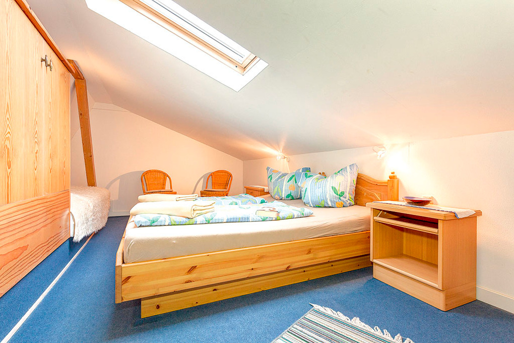 D 129.744 Wohnung 2-4 Pers.: 3-Zimmerwohnung mit 55 qm Wohnfläche, 1. Etage. Wohn-/Essraum mit Sitzgarnitur, Sat-TV, Esstisch. Küchenblock (2 Pl. E-Herd) in Flurnische. Doppelzimmer. Bad/WC. Schmale, steile Stiege ins Dachgeschoss (starke Schräge): Doppelzimmer mit franz. Bett, offen zum Wohnraum.