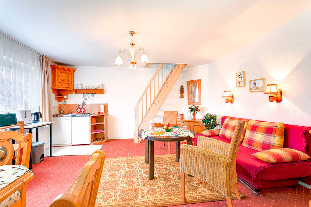 D 129.741 Wohnung 2-3 Pers.: 2-Zimmerwohnung mit 45 qm Wohnfläche, 1. Etage. Wohn-/Essraum mit Sitzgarnitur, Sat-TV, gemütlicher Eckbank, Esstisch, Küchenblock (2 Pl. E-Herd). Bad/WC. Schmale, steile Stiege ins Dachgeschoss (starke Schräge): 3-Bettzimmer mit Doppelbett, Einzelbett, offen zum Wohnraum.