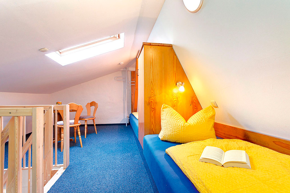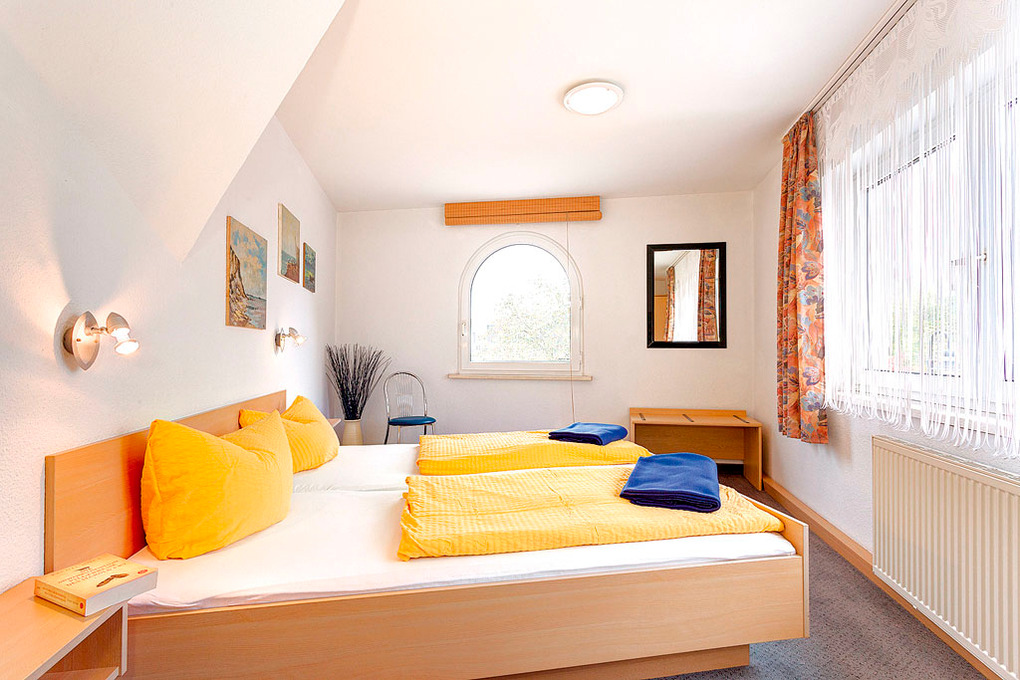 D 129.741 Wohnung 2-3 Pers.: 2-Zimmerwohnung mit 45 qm Wohnfläche, 1. Etage. Wohn-/Essraum mit Sitzgarnitur, Sat-TV, gemütlicher Eckbank, Esstisch, Küchenblock (2 Pl. E-Herd). Bad/WC. Schmale, steile Stiege ins Dachgeschoss (starke Schräge): 3-Bettzimmer mit Doppelbett, Einzelbett, offen zum Wohnraum.
