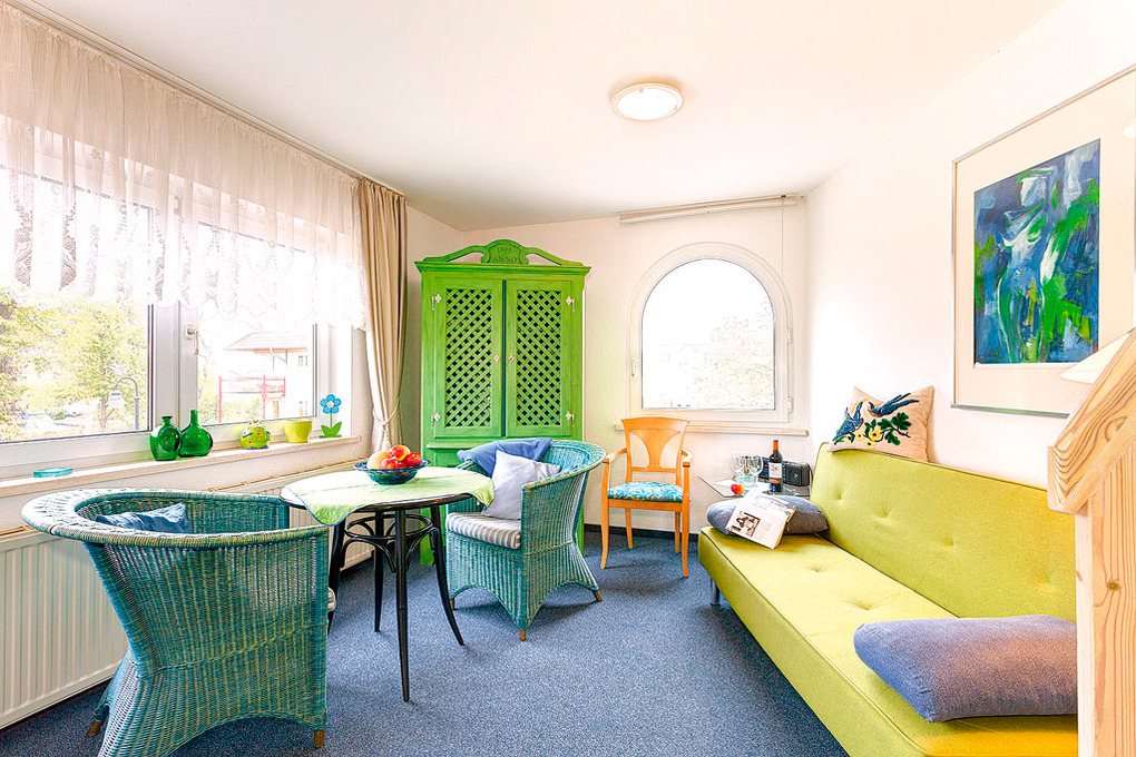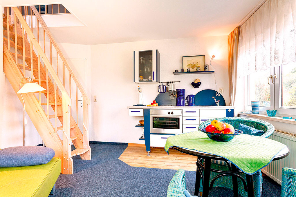 D 129.744 Wohnung 2-4 Pers.: 3-Zimmerwohnung mit 55 qm Wohnfläche, 1. Etage. Wohn-/Essraum mit Sitzgarnitur, Sat-TV, Esstisch. Küchenblock (2 Pl. E-Herd) in Flurnische. Doppelzimmer. Bad/WC. Schmale, steile Stiege ins Dachgeschoss (starke Schräge): Doppelzimmer mit franz. Bett, offen zum Wohnraum.