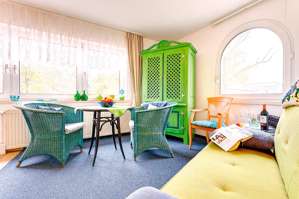D 129.748 Wohnung 2-3 Pers.: 2-Zimmerwohnung mit 45 qm Wohnfläche, Parterre. Wohn-/Essraum mit Couchgarnitur (Ausziehcouch 1 Pers.), Flachbild-Sat-TV, Esstisch, moderner Küchenzeile (Backofen). Doppelzimmer. Bad/WC.