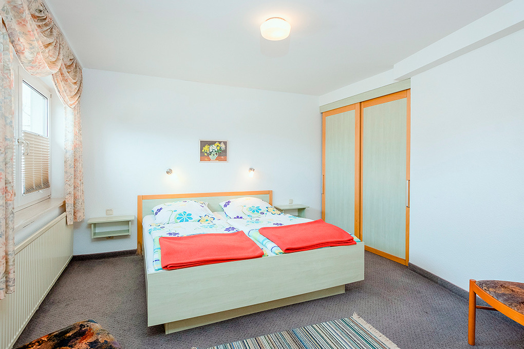 D 129.742 Wohnung 2-4 Pers.: 3-Zimmerwohnung mit 65 qm Wohnfläche, 1. Etage. Wohn-/Essraum mit Couchgarnitur, Sat-TV, Esstisch, kleiner Küchenzeile (Backofen). 2 Doppelzimmer. Bad/WC. Balkon mit Strandkorb.
