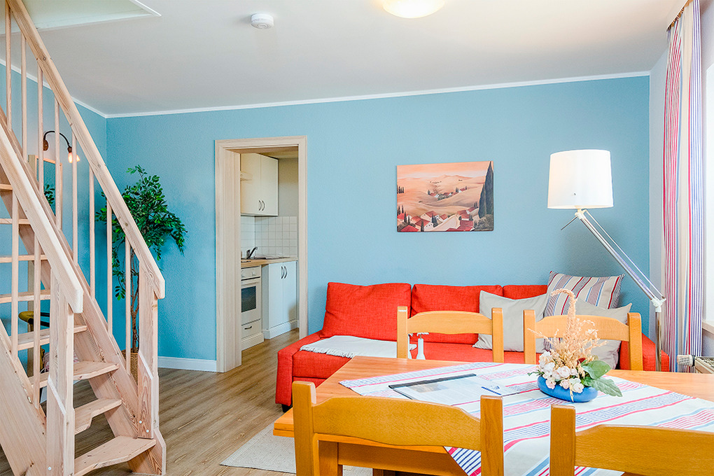 D 129.747 Wohnung 2-4 Pers.: 2-Zimmerwohnung mit 45 qm Wohnfläche, Parterre. Wohn-/Essraum mit Couchgarnitur (Ausziehcouch 2 Pers.), Flachbild-Sat-TV, Esstisch, moderner Küchenzeile (Backofen). Doppelzimmer. Bad/WC. Kleine Terrasse.
