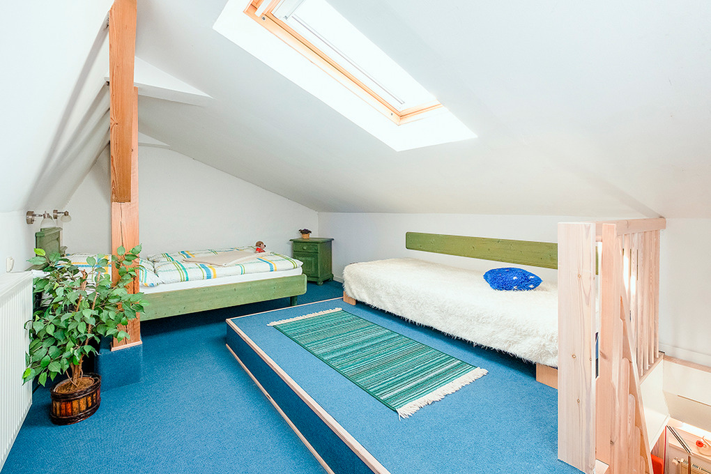 D 129.743 Wohnung 2-4 Pers.: 3-Zimmerwohnung mit 55 qm Wohnfläche, 1. Etage. Wohn-/Essraum mit Sitzgarnitur, Sat-TV, Esstisch, Küchenblock (2 Pl. E-Herd, Backofen). Doppelzimmer. Bad/WC. Schmale, steile Stiege ins Dachgeschoss (starke Schräge): 2-Bettzimmer, offen zum Wohnraum.
