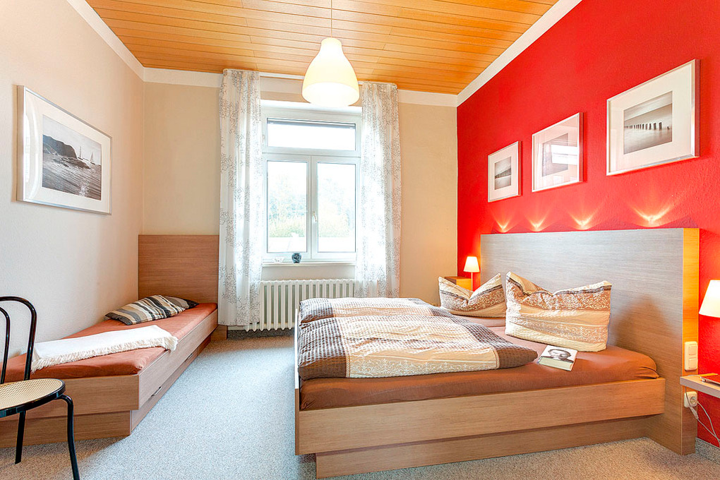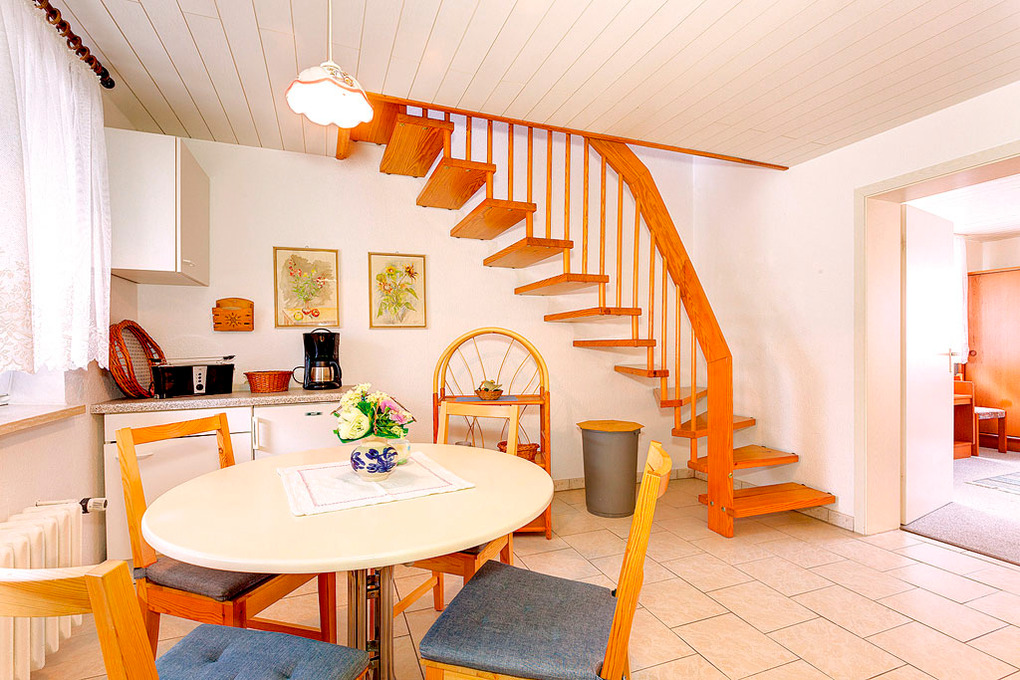 D 129.741 Wohnung 2-3 Pers.: 2-Zimmerwohnung mit 45 qm Wohnfläche, 1. Etage. Wohn-/Essraum mit Sitzgarnitur, Sat-TV, gemütlicher Eckbank, Esstisch, Küchenblock (2 Pl. E-Herd). Bad/WC. Schmale, steile Stiege ins Dachgeschoss (starke Schräge): 3-Bettzimmer mit Doppelbett, Einzelbett, offen zum Wohnraum.