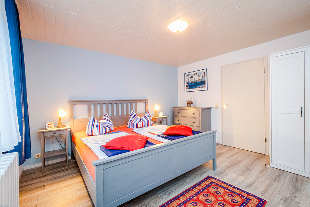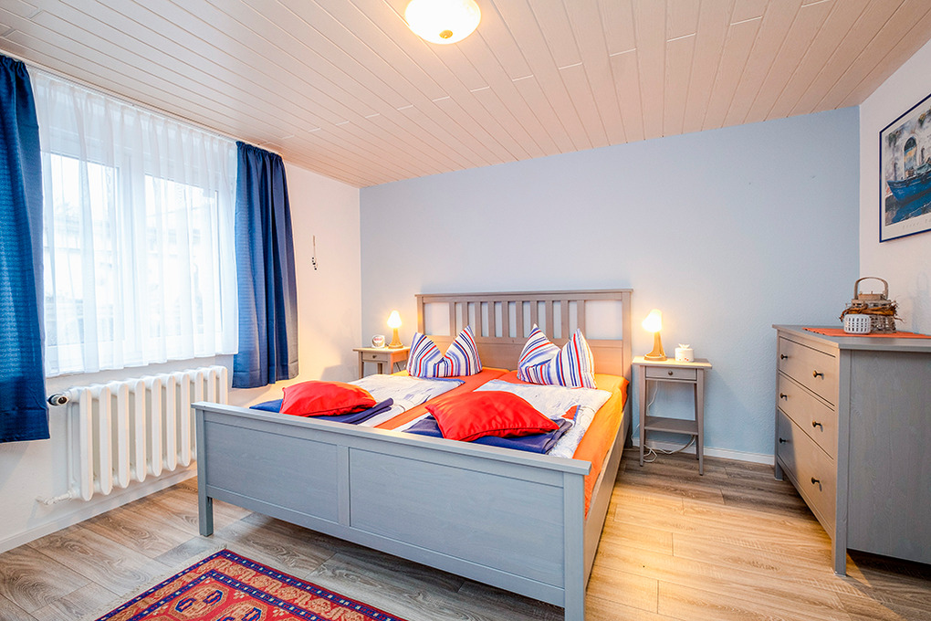 D 129.742 Wohnung 2-4 Pers.: 3-Zimmerwohnung mit 65 qm Wohnfläche, 1. Etage. Wohn-/Essraum mit Couchgarnitur, Sat-TV, Esstisch, kleiner Küchenzeile (Backofen). 2 Doppelzimmer. Bad/WC. Balkon mit Strandkorb.