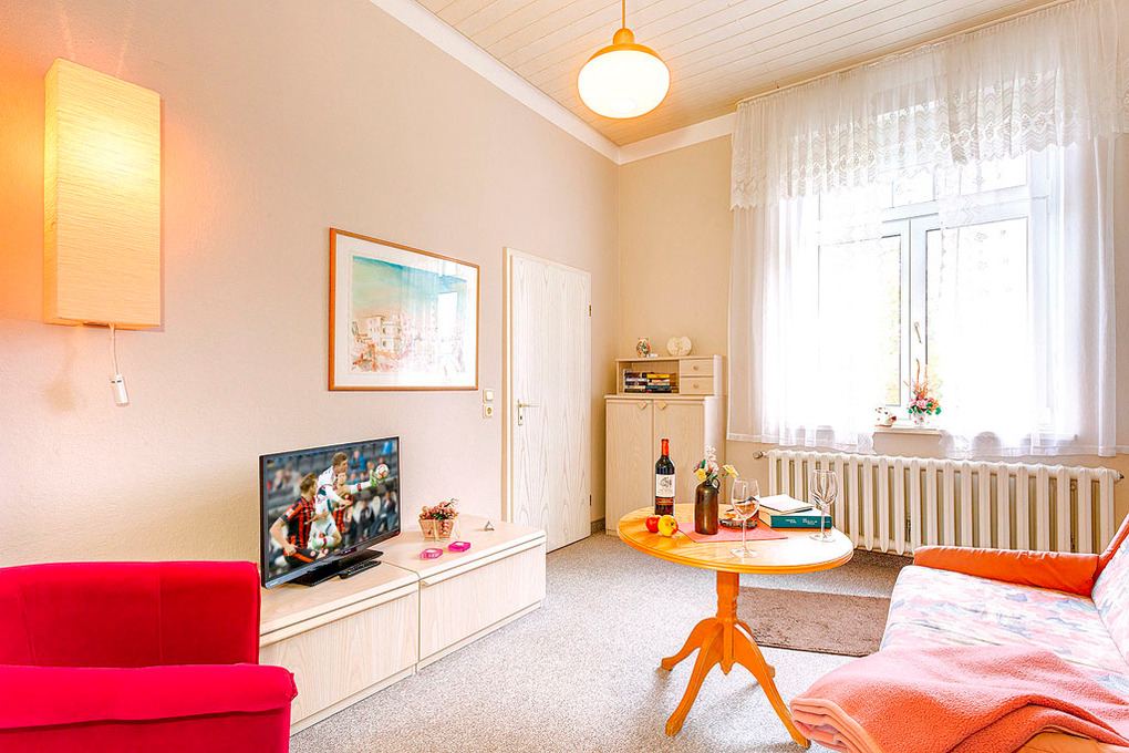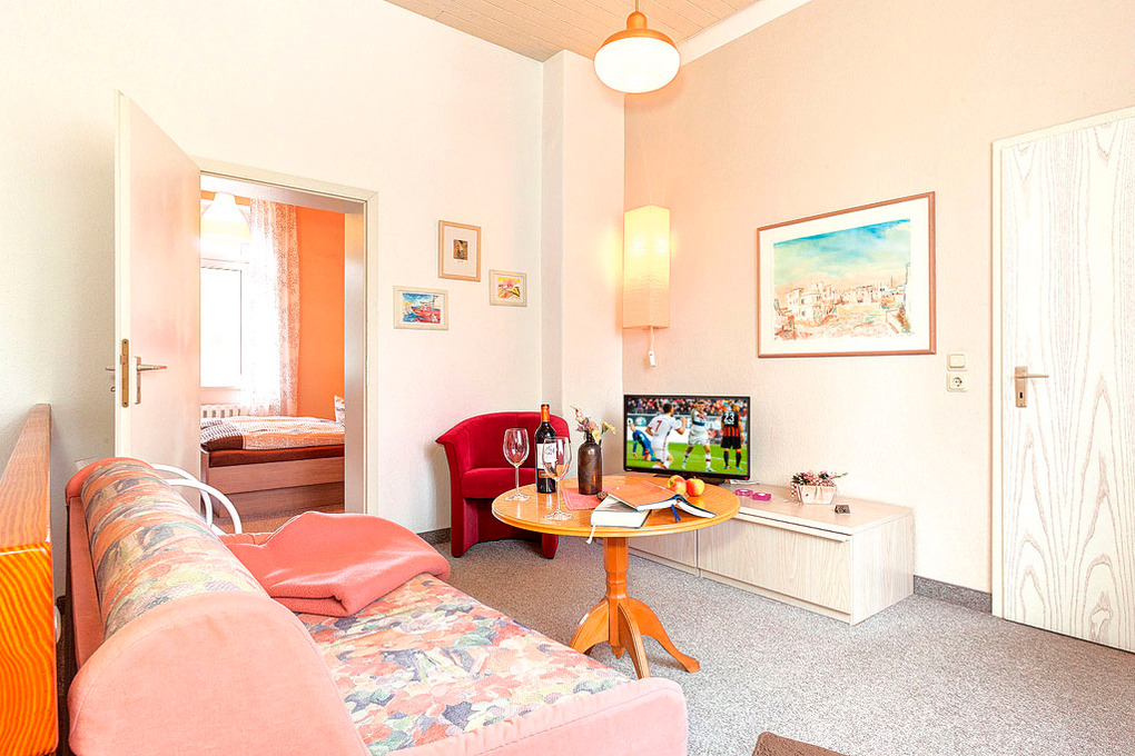 D 129.748 Wohnung 2-3 Pers.: 2-Zimmerwohnung mit 45 qm Wohnfläche, Parterre. Wohn-/Essraum mit Couchgarnitur (Ausziehcouch 1 Pers.), Flachbild-Sat-TV, Esstisch, moderner Küchenzeile (Backofen). Doppelzimmer. Bad/WC.