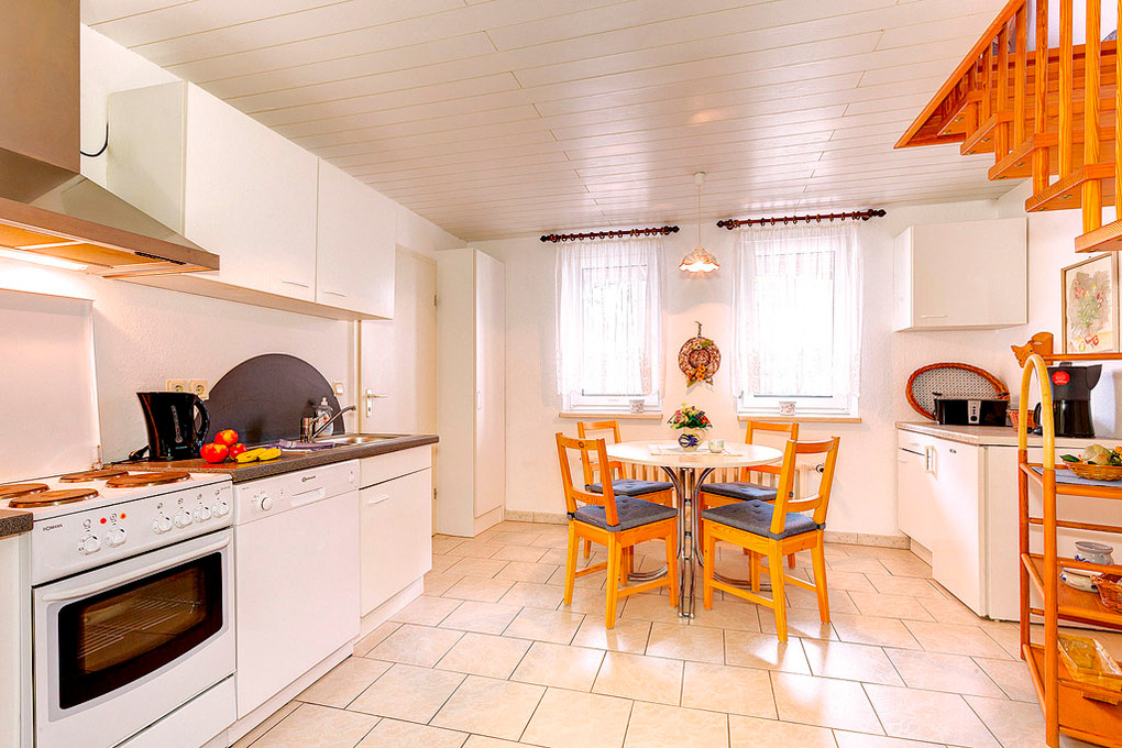 D 129.745 Wohnung 2-4 Pers.: 3 1/2-Zimmerwohnung mit 65 qm Wohnfläche, 1. Etage. Wohnraum mit Sitzgarnitur, Sat-TV. 3-Bettzimmer mit Doppelbett, Einzelbett. Treppe ins Parterre: Separate Küche mit Esstisch, Küchenzeile (Backofen, Spülmaschine). Doppelzimmer. Bad/WC.