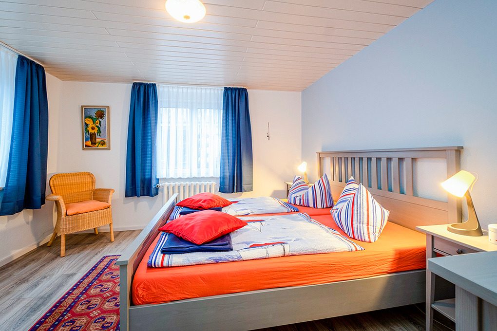 D 129.744 Wohnung 2-4 Pers.: 3-Zimmerwohnung mit 55 qm Wohnfläche, 1. Etage. Wohn-/Essraum mit Sitzgarnitur, Sat-TV, Esstisch. Küchenblock (2 Pl. E-Herd) in Flurnische. Doppelzimmer. Bad/WC. Schmale, steile Stiege ins Dachgeschoss (starke Schräge): Doppelzimmer mit franz. Bett, offen zum Wohnraum.