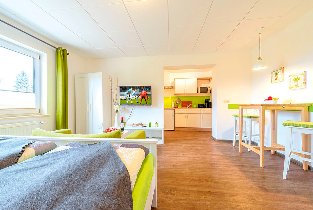 D 129.746 Wohnung 2 Pers.: Studio mit 30 qm Wohnfläche, Parterre. Wohn-/Schlafraum mit Doppelbett, Flachbild-Sat-TV, Esstisch, kleiner Küchenzeile (Mikrowelle). Bad: Wb, WC. Separate Dusche.