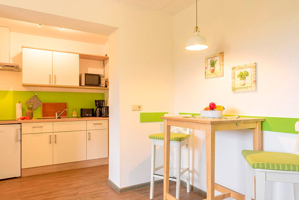 D 129.748 Wohnung 2-3 Pers.: 2-Zimmerwohnung mit 45 qm Wohnfläche, Parterre. Wohn-/Essraum mit Couchgarnitur (Ausziehcouch 1 Pers.), Flachbild-Sat-TV, Esstisch, moderner Küchenzeile (Backofen). Doppelzimmer. Bad/WC.