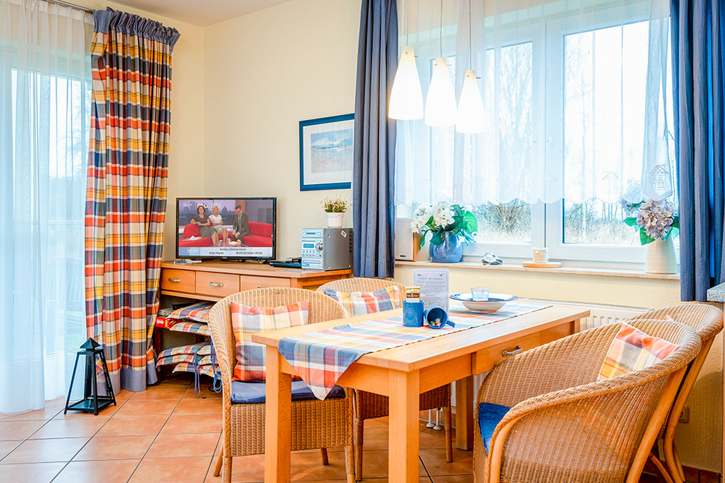 D 130.55 Wohnung 2-4 Pers.: 3-Zimmerwohnung mit 65 qm Wohnfläche, Parterre. Wohn-/Essraum mit Couchgarnitur, Sat-TV, Radio/CD, Esstisch, gut ausgestatteter Küchenzeile (Backofen, Mikrowelle, Spülmaschine). Doppelzimmer. 2-Bettzimmer. Bad: Du, Wb, WC.