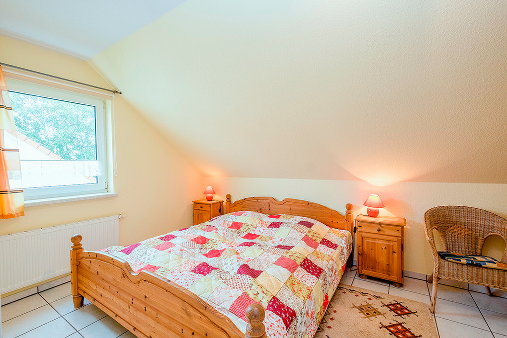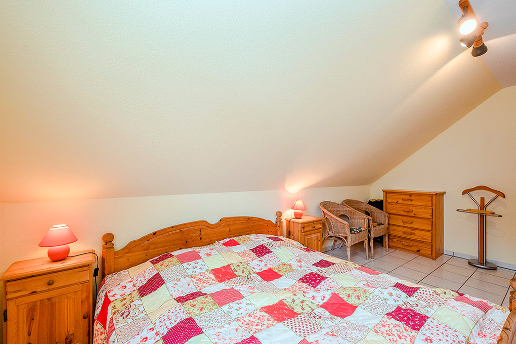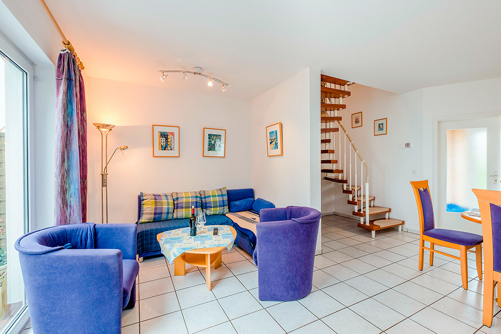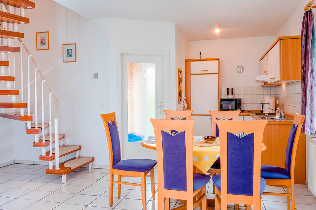 D 132.25 Ferienhaus 3-6 Pers.: 3-Zimmerhaushälfte mit ca. 70 qm Wohnfläche. Parterre: Großer Wohnraum mit gemütlicher Sitzecke (Ausziehcouch 2 Pers.), Sat-TV, Stereoanlage, Esstisch, Einbauküche (Backofen, Mikrowelle, Spülmaschine). Vom Wohnraum Treppe in die 1. Etage (leichte Schrägen): Doppelzimmer. 2-Bettzimmer. Bad/WC.