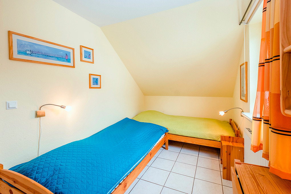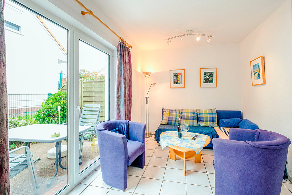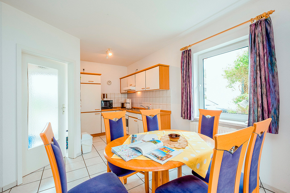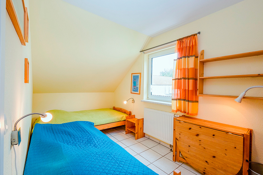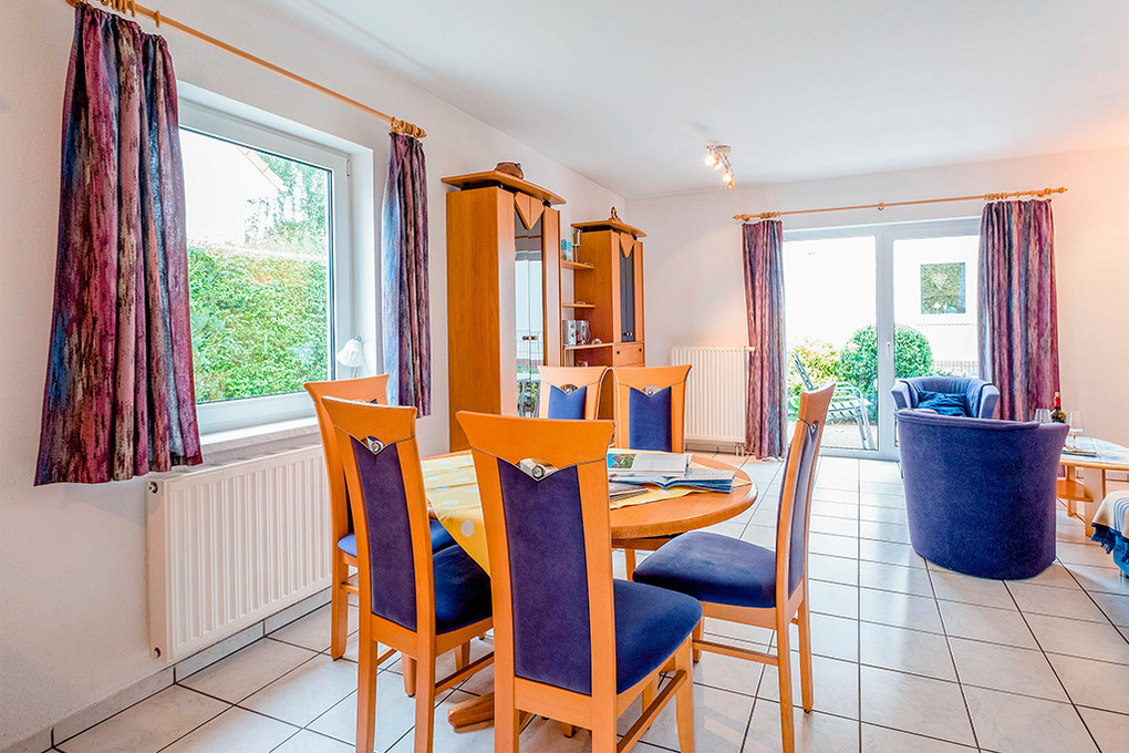 D 132.25 Ferienhaus 3-6 Pers.: 3-Zimmerhaushälfte mit ca. 70 qm Wohnfläche. Parterre: Großer Wohnraum mit gemütlicher Sitzecke (Ausziehcouch 2 Pers.), Sat-TV, Stereoanlage, Esstisch, Einbauküche (Backofen, Mikrowelle, Spülmaschine). Vom Wohnraum Treppe in die 1. Etage (leichte Schrägen): Doppelzimmer. 2-Bettzimmer. Bad/WC.