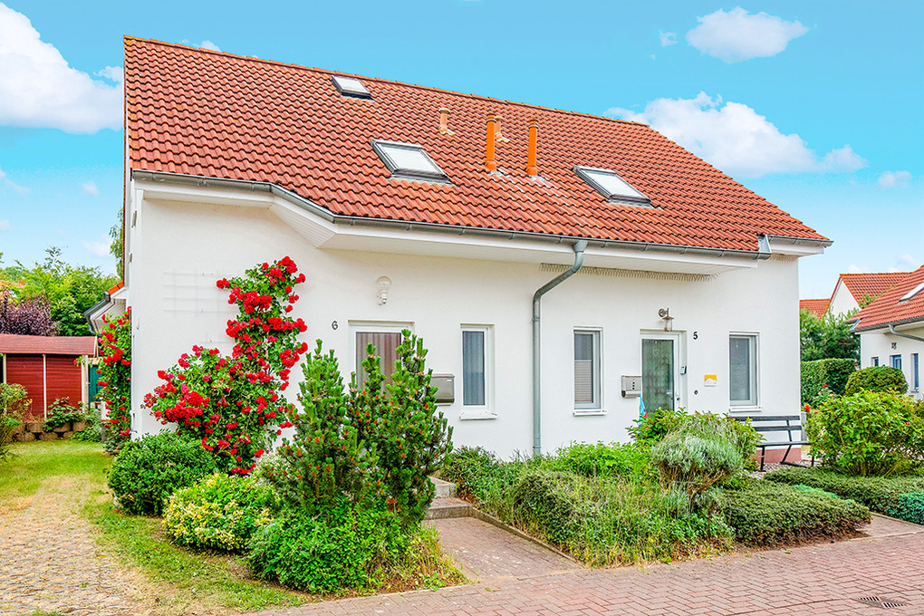 Haus: Komfortable Doppelhaushälfte mit gemütlicher Einrichtung. Geschmackvolle Möblierung. Zentralheizung. Kleiner Garten mit Terrasse, Sitzmöbeln, Grill-Kamin. Pkw-Stellplatz am Haus