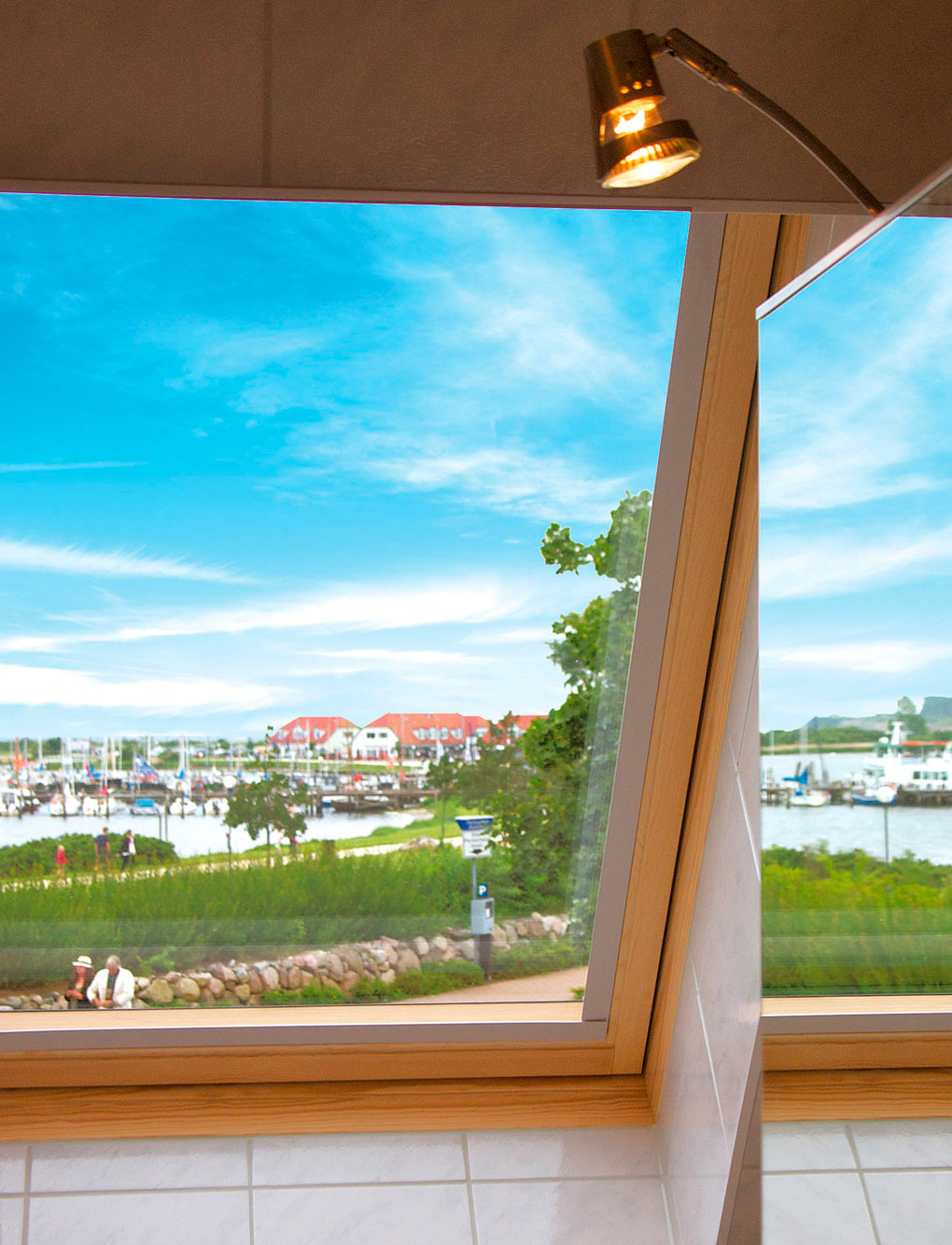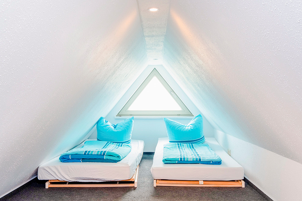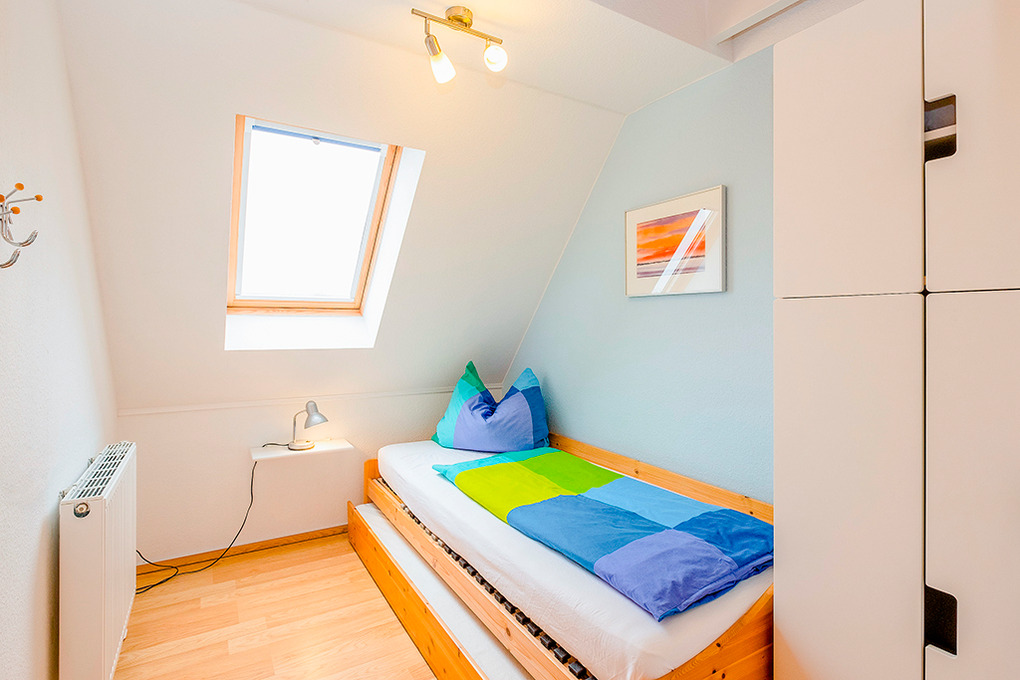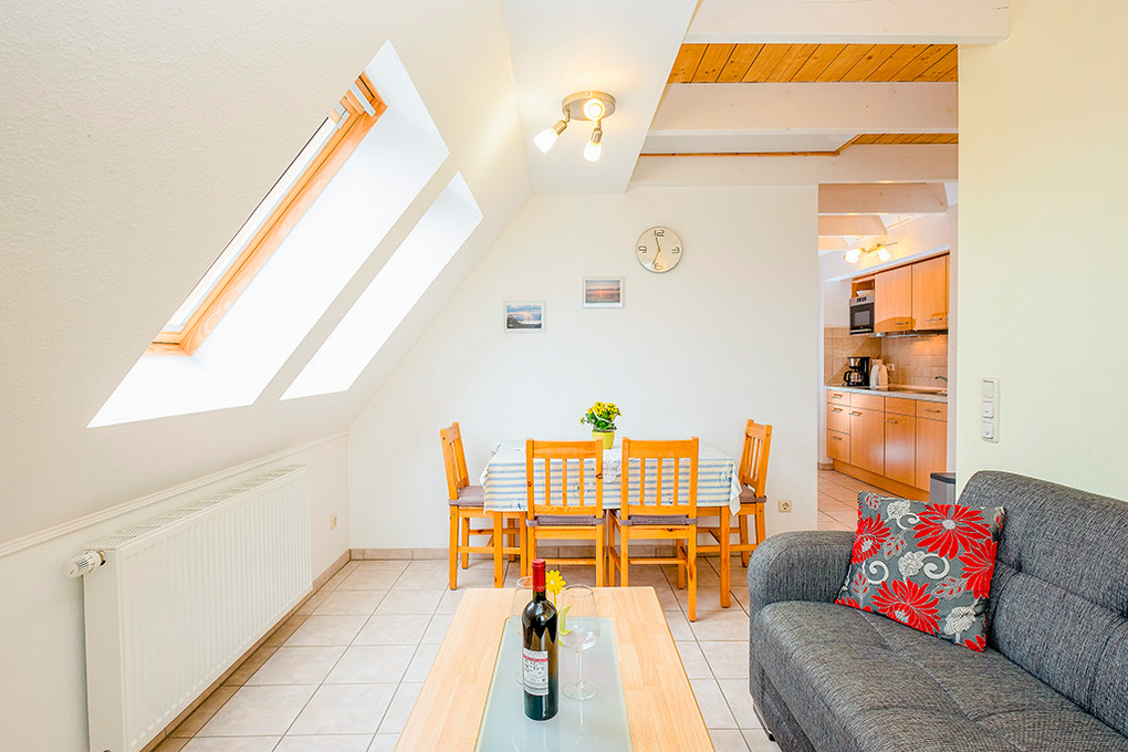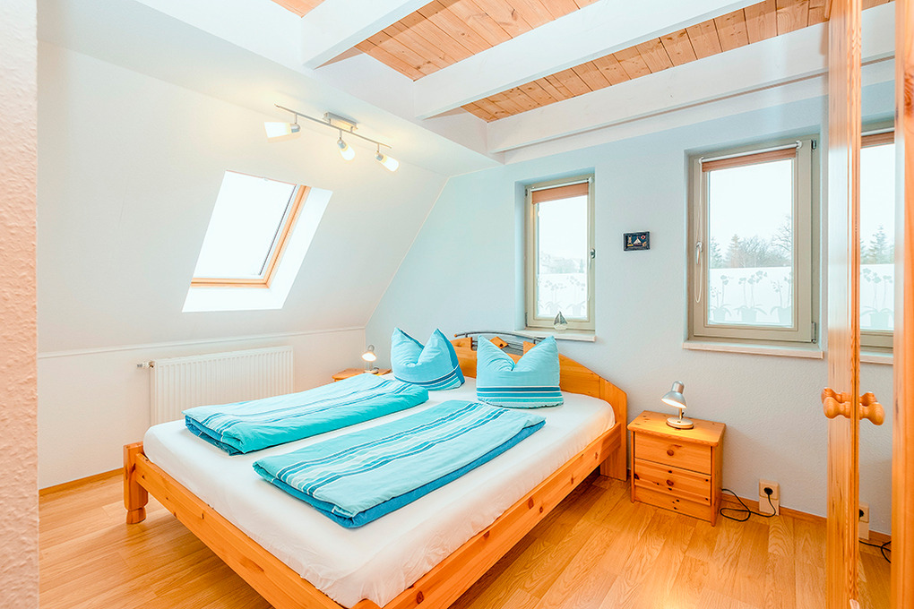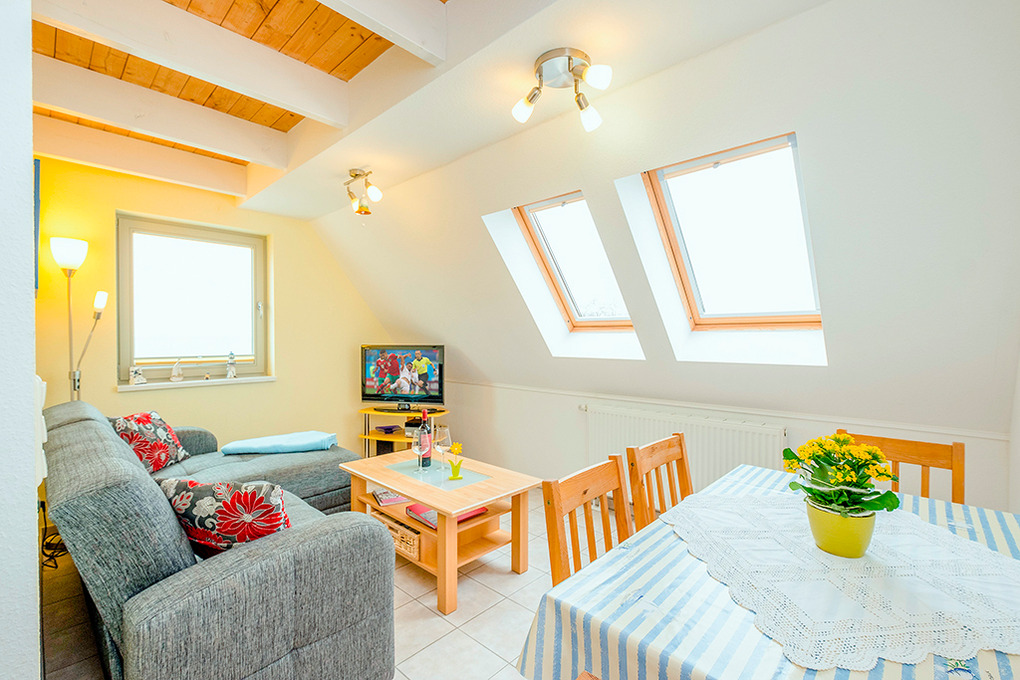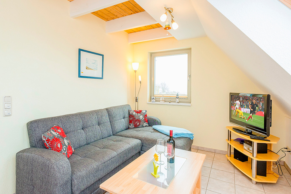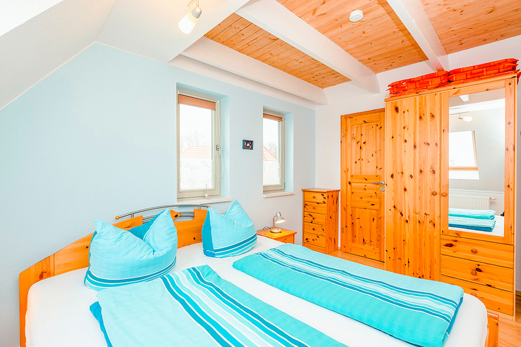 D 132.27 Wohnung 2-4 Pers.: 3-Zimmerwohnung mit 45 qm Wohnfläche, 1. Etage (Dachschrägen): Wohn-/Essraum mit Couchgarnitur, Sat-TV, Radio/CD, Esstisch, Einbauküche (Mikrowelle, Spülmaschine). Doppelzimmer. Kleines 2-Bettzimmer mit Einzelbett, Ausziehbett. Bad/WC mit Waschmaschine. Klapptreppe in den Spitzboden: Spiel- und Ruheraum mit Einzelmatratzen, schönem Wasserblick. Balkon mit Blick aufs Salzhaff.