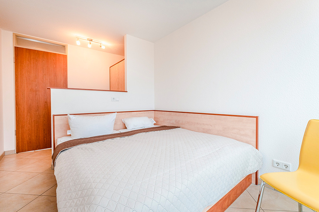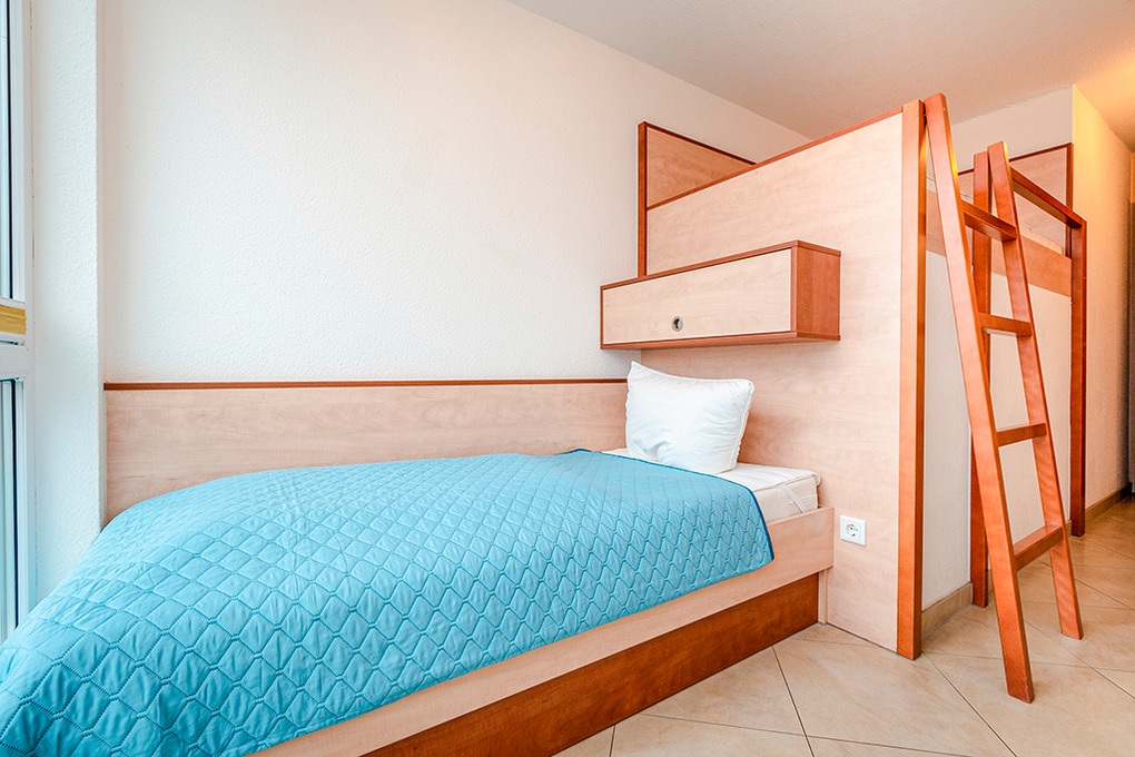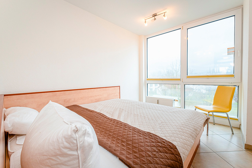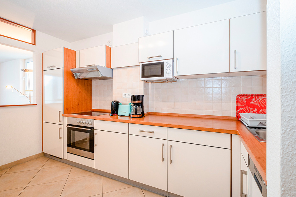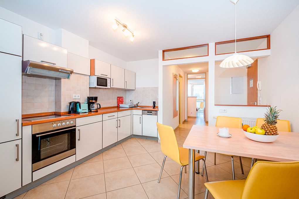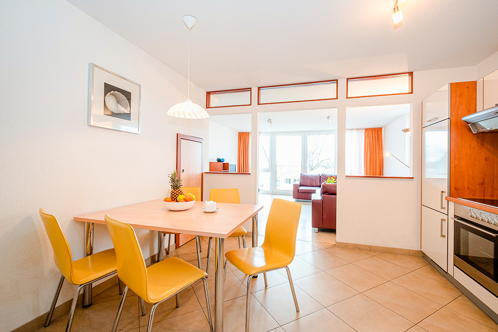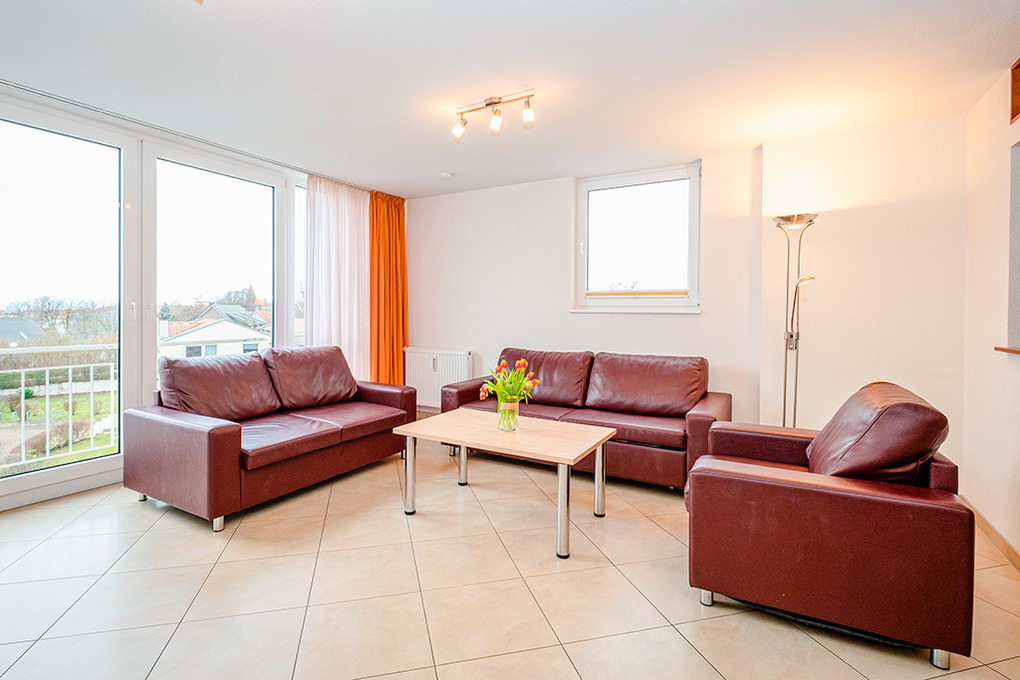 D 132.72A Wohnung 2-6 Pers.: 3-Zimmerwohnung, 70 qm Wohnfläche, 2. Etage. Wohn-/Essraum mit großer Panoramafensterfront, Wasserblick übers Haff bis zur Ostsee, Couchgarnitur (Schlafsofa 1-2 Pers.), Esstisch, moderner Einbauküche. Doppelzimmer. 2-Bettzimmer mit Einzelbett, Hochbett. Bad/WC.