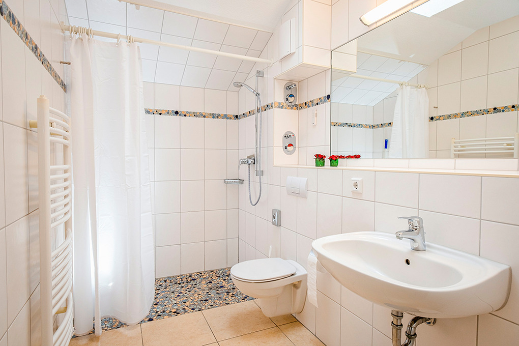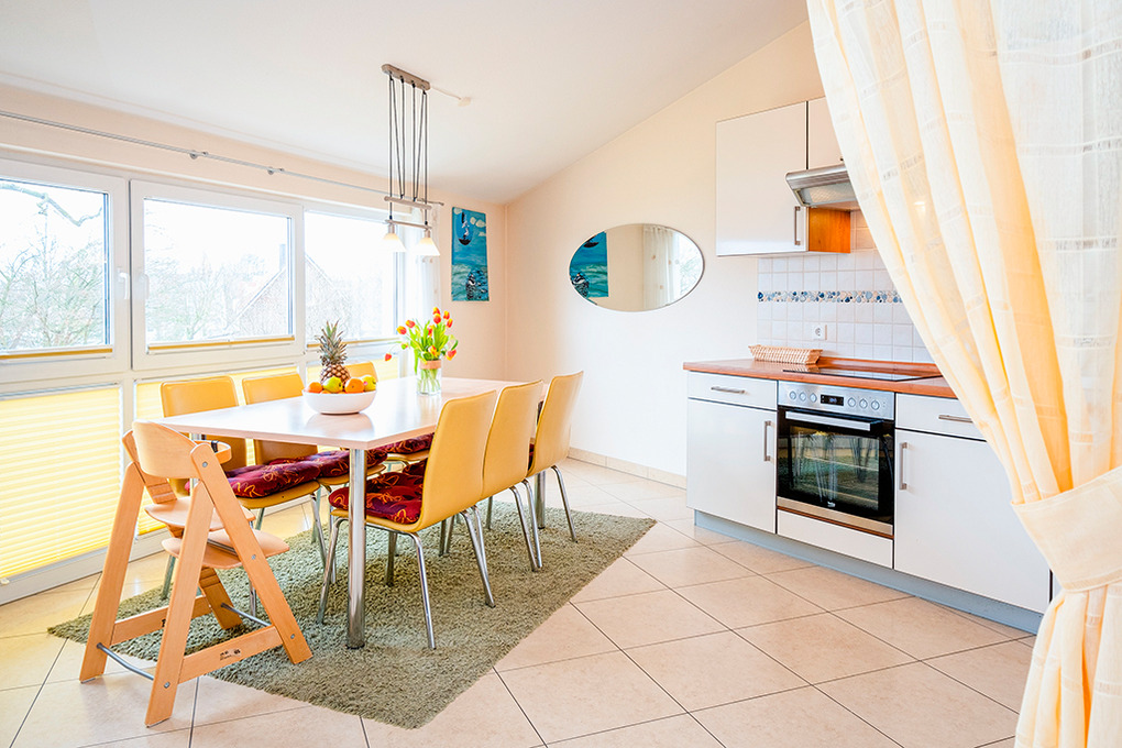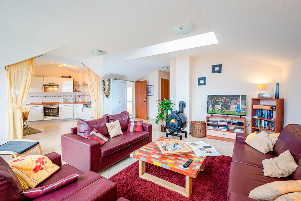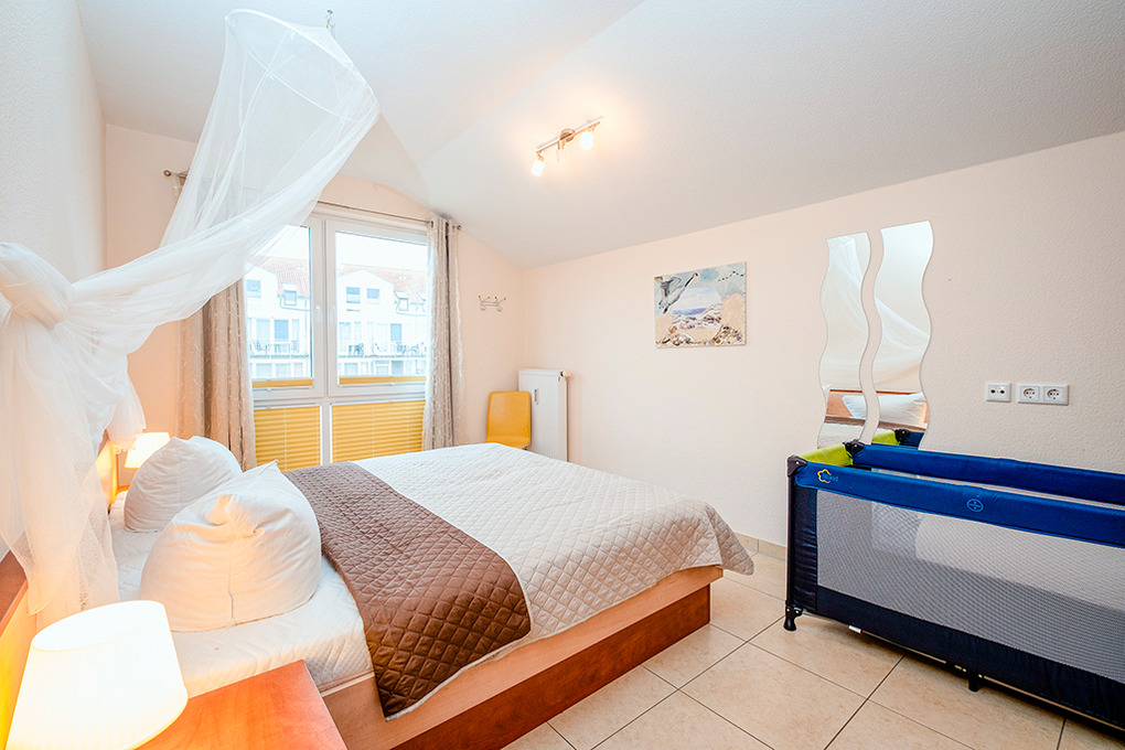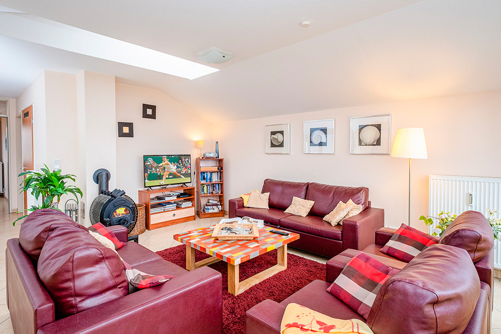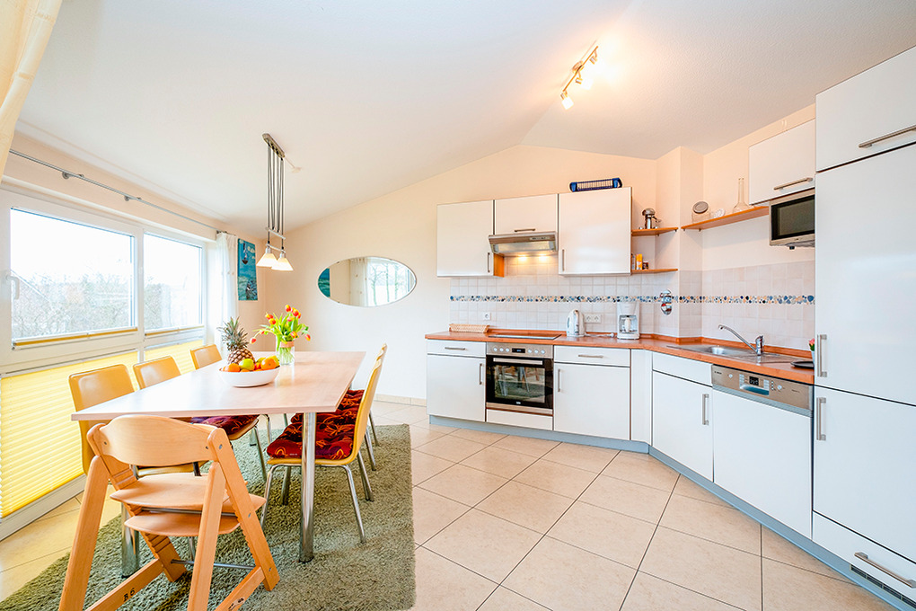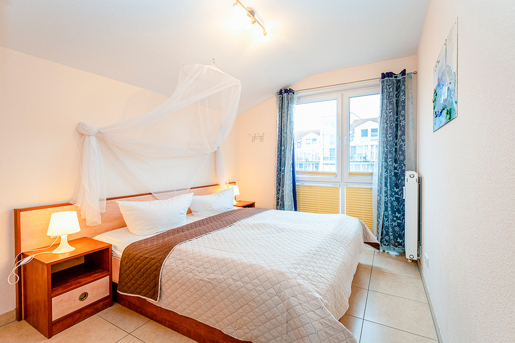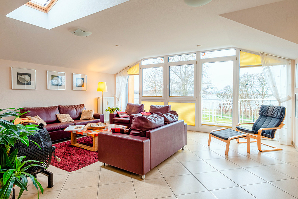 D 132.74D Wohnung 2-6 Pers.: 3-Zimmerwohnung, 74 qm Wohnfläche, 1. Etage, 1. Reihe zum Salzhaff. Wohn-/Essraum mit Kaminofen, Couchgarnitur (Schlafcouch 1-2 Pers.), Esstisch, moderner Einbauküche. Zwei Doppelzimmer. Bad/WC. Großer Balkon mit Sitzmöbeln, sehr schönem Wasserblick.