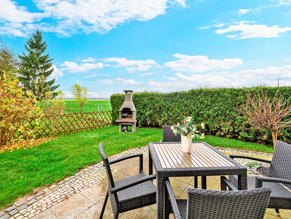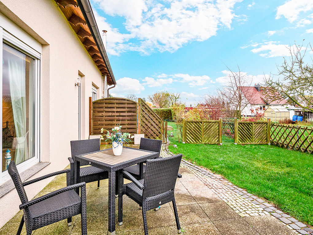 Haus: Schönes, neues Ferienhaus mit 2 Ferienwohnungen auf abgeschlossenem Gartengrundstück. Außerordentlich gute Einrichtung. E-Fußbodenheizung. Internetzugang über W-Lan. Terrasse (25 qm) mit Sitzmöbeln, weitem Ausblick. Mit ihrem schönen Garten bietet die Fewo Ferienhaus-Ambiente.