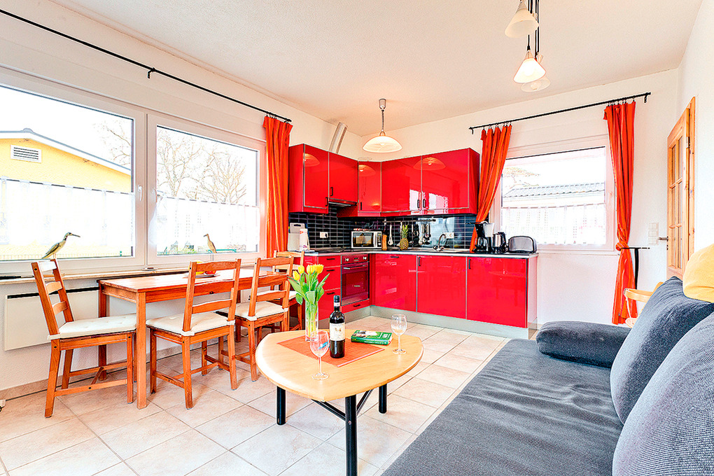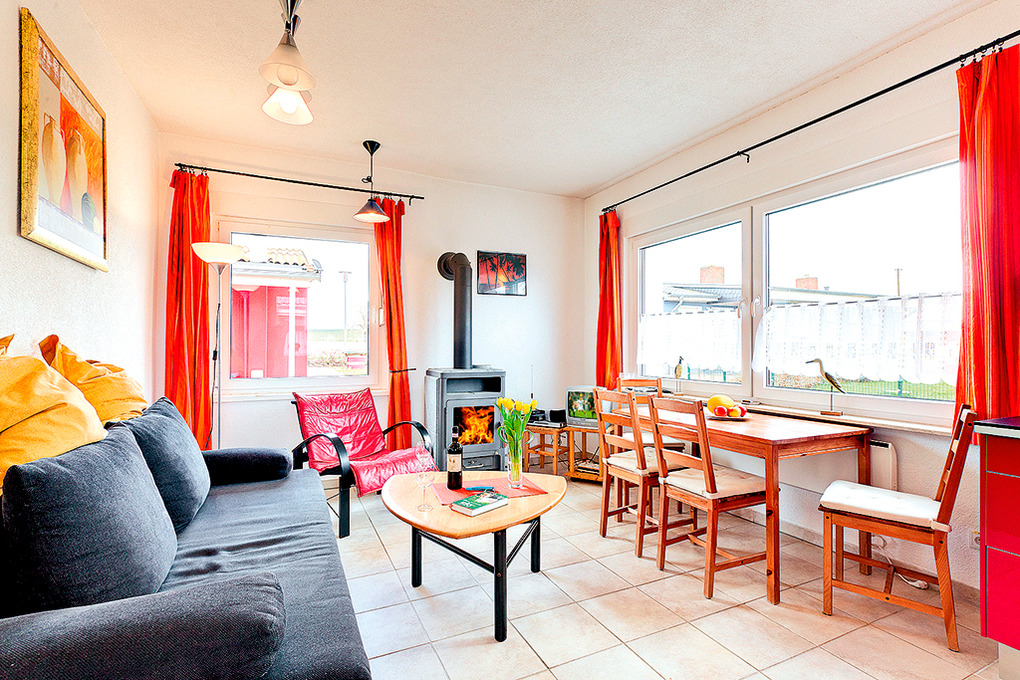 D 133.103 Ferienhaus 2-4 Pers.: 2-Zimmer-Haushälfte, 37 qm Wohnfläche. Gemütlicher Wohn-/Essraum mit Kaminofen, Sitzecke (Schlafsofa 2 Pers.), Sat-TV, DVD, Radio/CD, Esstisch, Küchenzeile (Backofen, Spülmaschine, Mikrowelle). Doppelzimmer. Bad/WC.