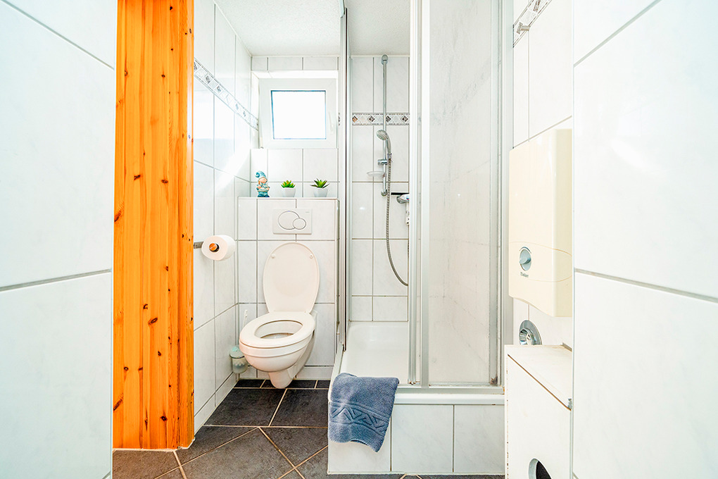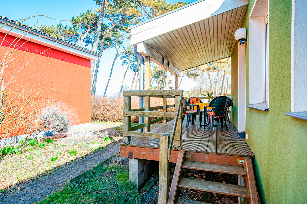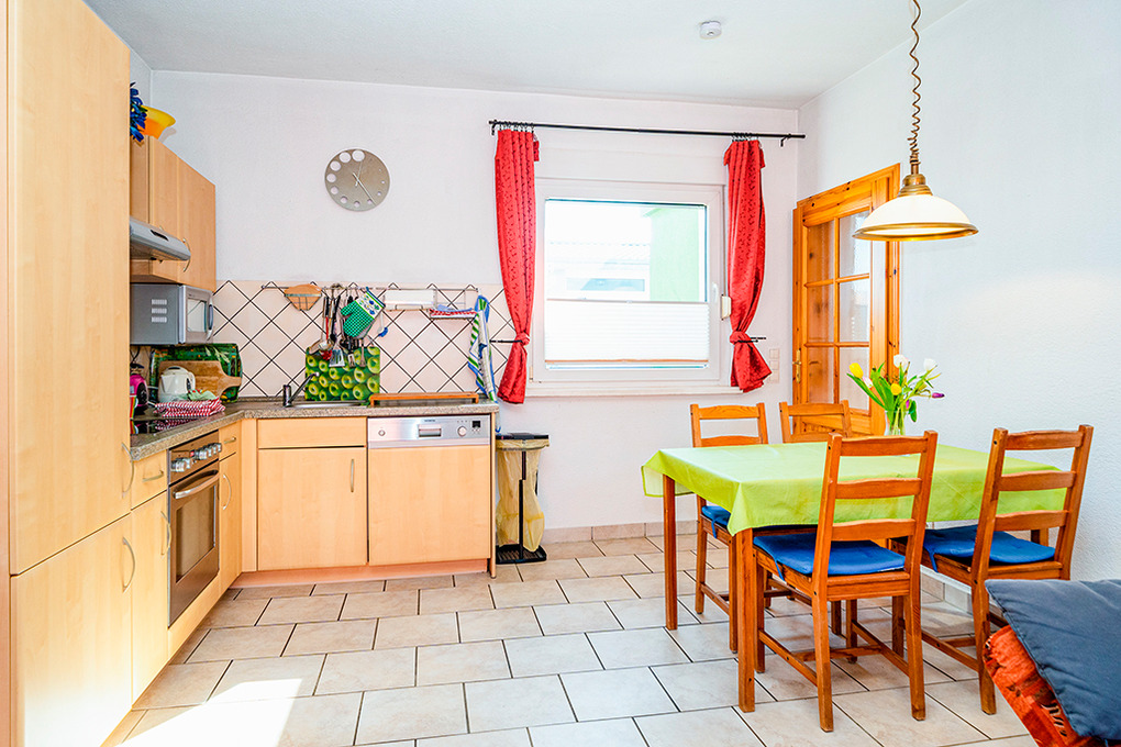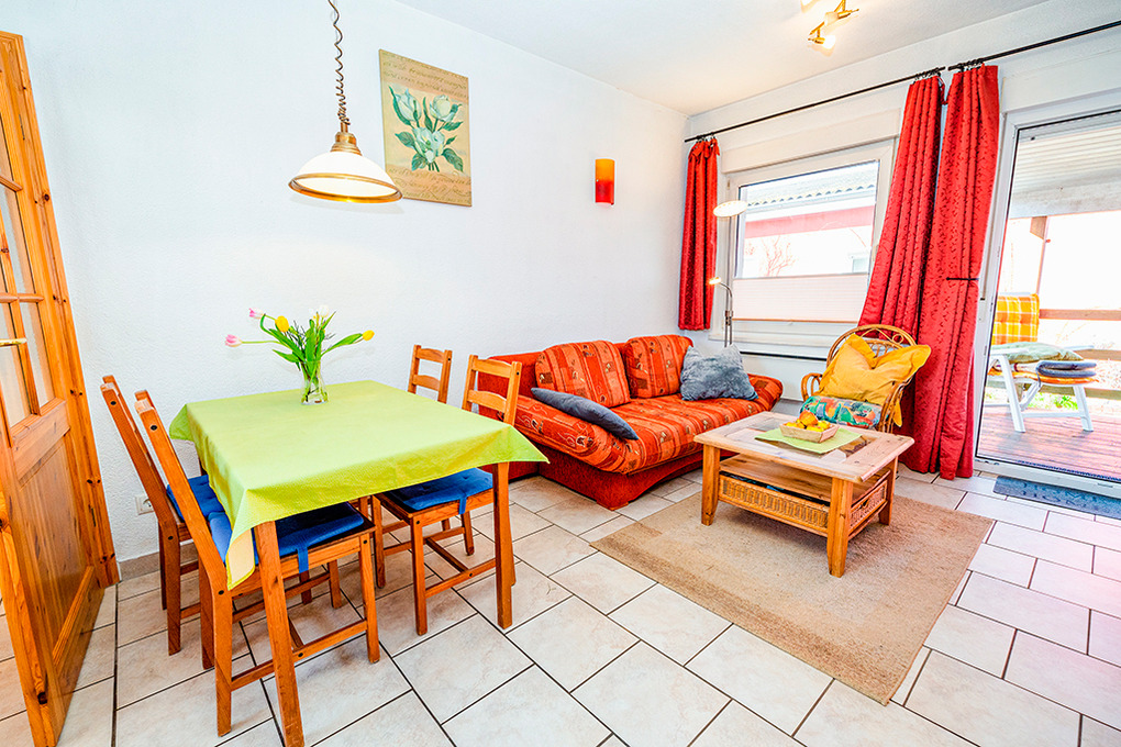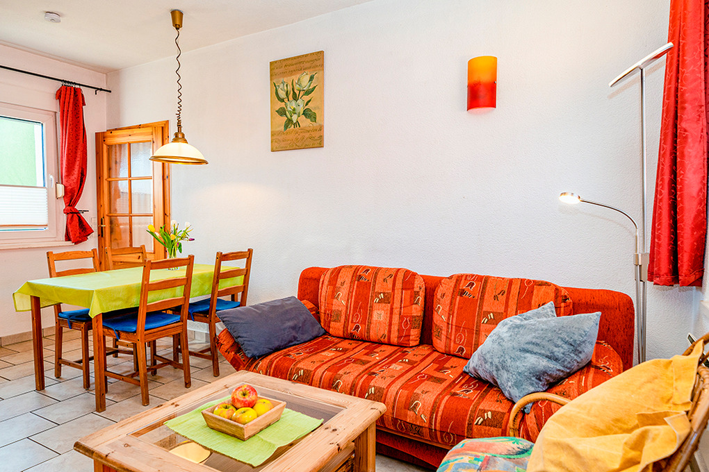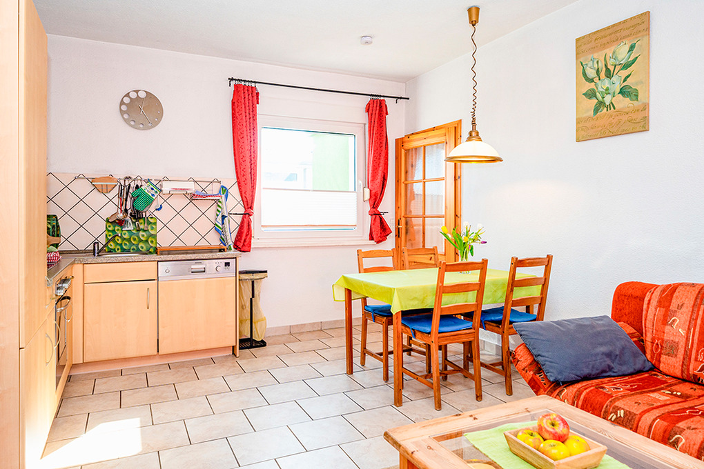 D 133.103A Ferienhaus 2-4 Pers.: 2-Zimmer-Haushälfte, 37 qm Wohnfläche. Gemütlicher Wohn-/Essraum mit Kaminofen, Sitzecke (Schlafsofa 2 Pers.), Sat-TV, DVD, Radio/CD, Esstisch, Küchenzeile (Backofen, Spülmaschine, Mikrowelle). Doppelzimmer. Bad/WC. Waschmaschine.