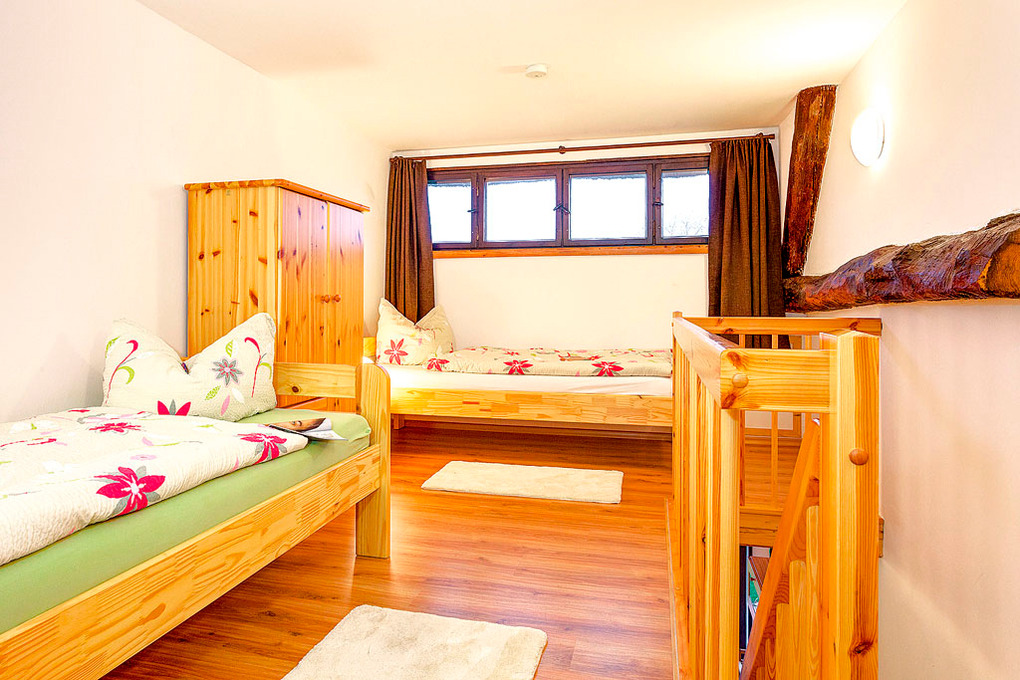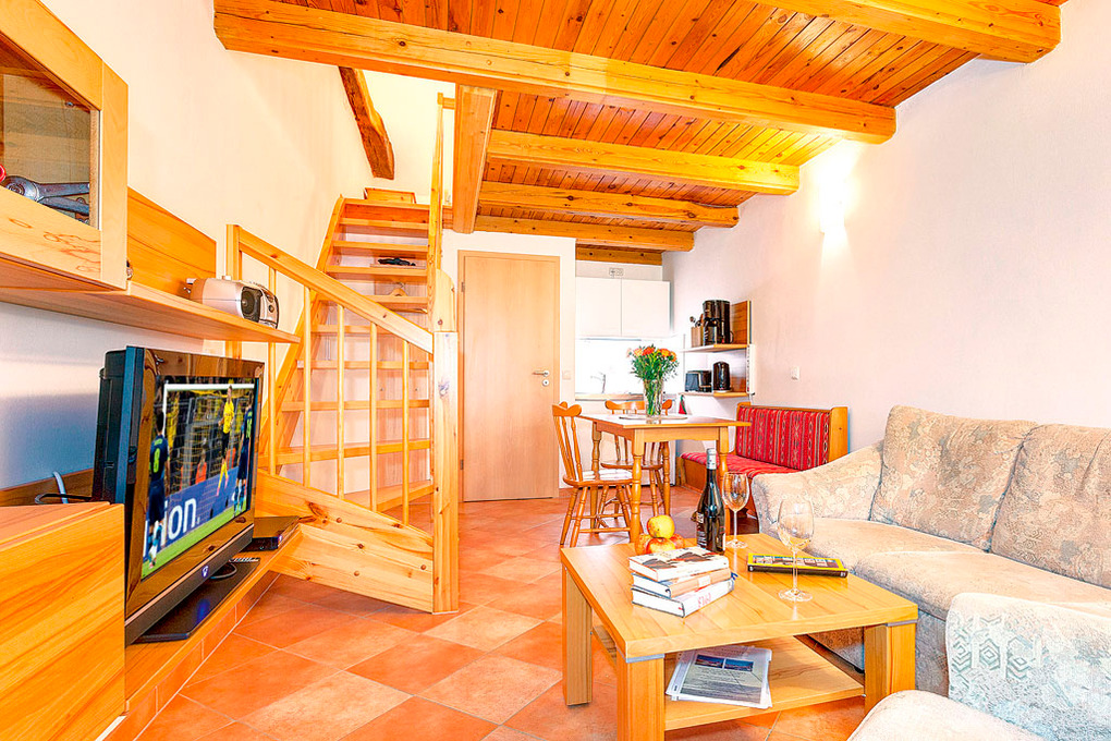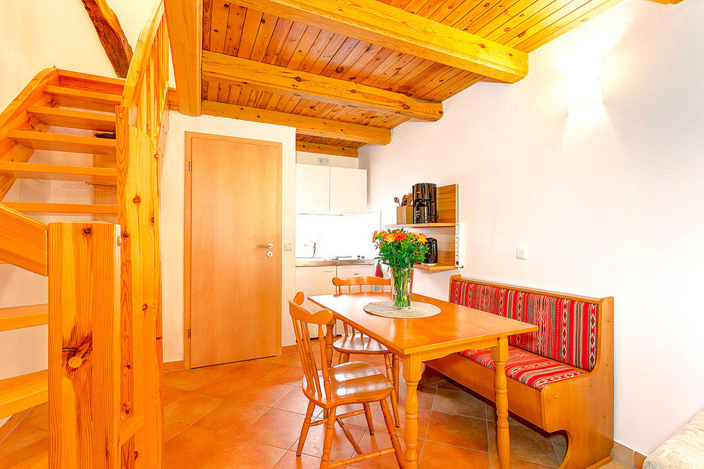 D 133.115A Wohnung 2-3 Pers.: 2-Zimmerwohnung mit ca. 40 qm Wohnfläche. Parterre: Wohn-/Essraum mit gemütlicher Sitzgruppe, Sat-TV, Radio/CD, Esstisch, Einbauküche (Backofen). Bad/WC. Vom Wohnraum aus Treppe ins ausgebaute Dachgeschoss: offenes 3-Bettzimmer mit Doppelbett, Einzelbett.