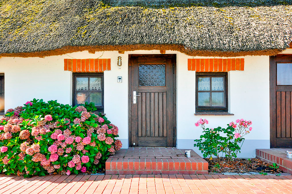Haus: Regionaltypisches Reetdachhaus einer ehemaligen Büdnerei. Das kleine ländliche Anwesen wurde mit viel Liebe zum Detail umgebaut und restauriert zu einem Ferienhaus mit fünf Wohnungen. Geschmackvolle Einrichtung, gemütlich-rustikales Ambiente mit schönen Holzbalkendecken. Kostenloser Internetzugang über W-Lan. Zentralheizung. Nichtraucherwohnungen. Großer Garten mit Wasserblick aufs Salzhaff, 1 Sitzecke pro Fewo, Spiel- und Liegewiese, Sandkasten, Schaukel, Rutsche, Grill (Gemeinschaftsnutzung). Parkmöglichkeiten für einen Pkw pro Fewo auf dem Anwesen. Hinweis: Fahrradverleih in Neubukow, Lieferservice zum Haus.