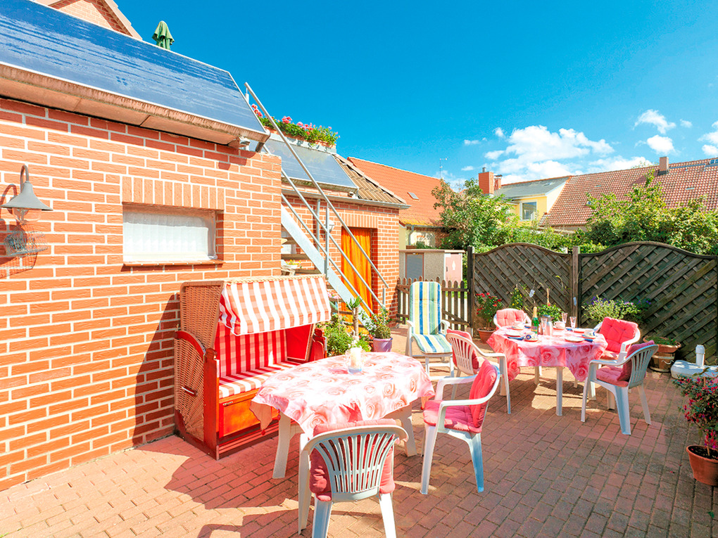 Haus: Hübsches Ferienhaus mit drei Ferienwohnungen. Gemütliche, gepflegte Einrichtung. Nichtraucherwohnungen. Zentralheizung. Kostenloser Internetzugang über W-Lan. Schöne Terrasse mit Sitzecken, Strandkorb, Grill zur gemeinschaftlichen Nutzung.