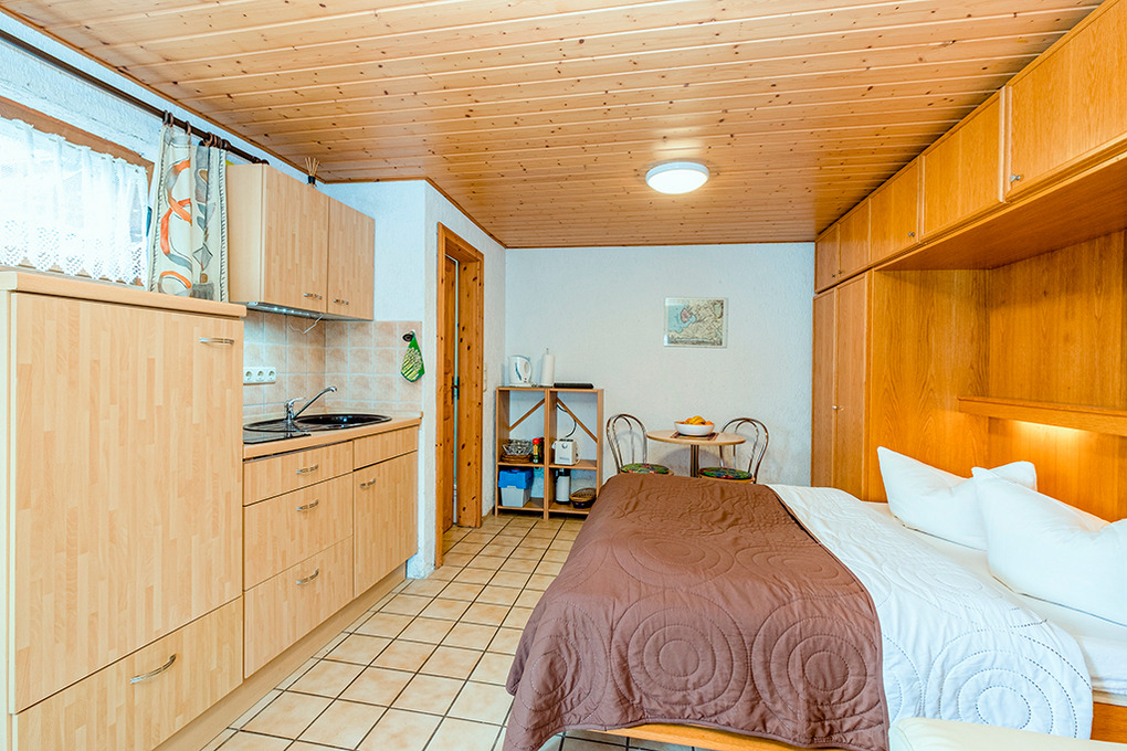 D 134.78 Wohnung 2 Pers.: Studio mit 25 qm Wohnfläche, Parterre. Schöner Wohn-/Schlafraum mit Doppelbett (Schrankbett), Sitzecke, Sat-TV, Radio/CD, kleinem Esstisch, Pantry-Küche. Bad/WC.