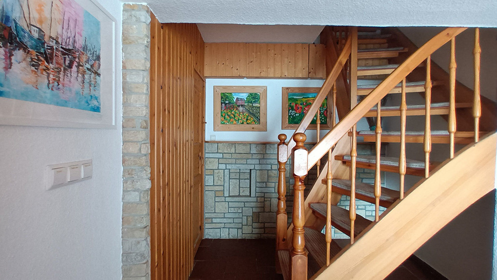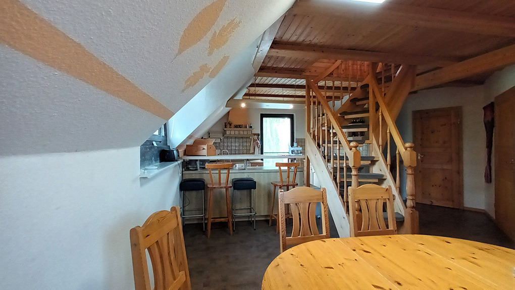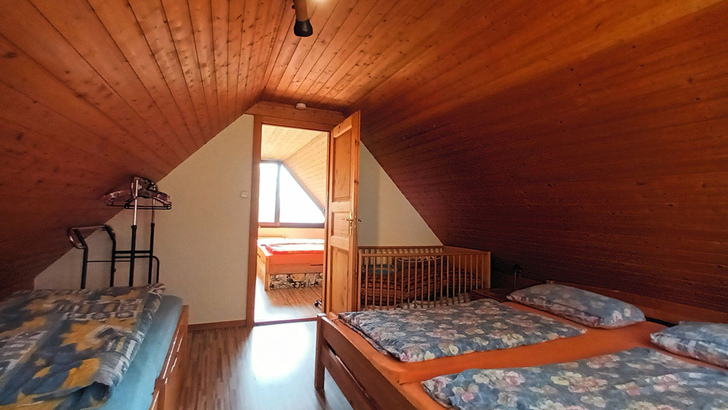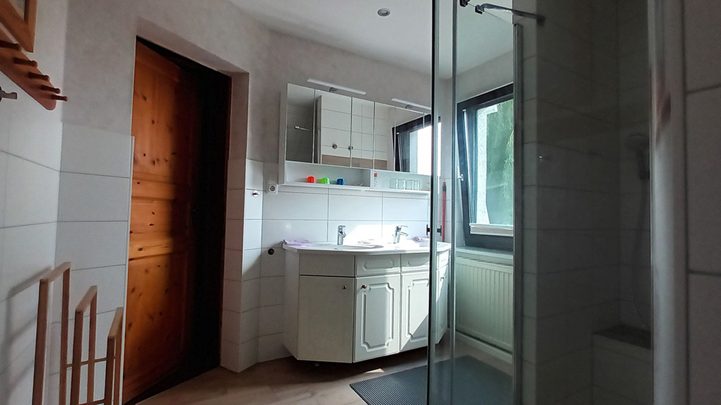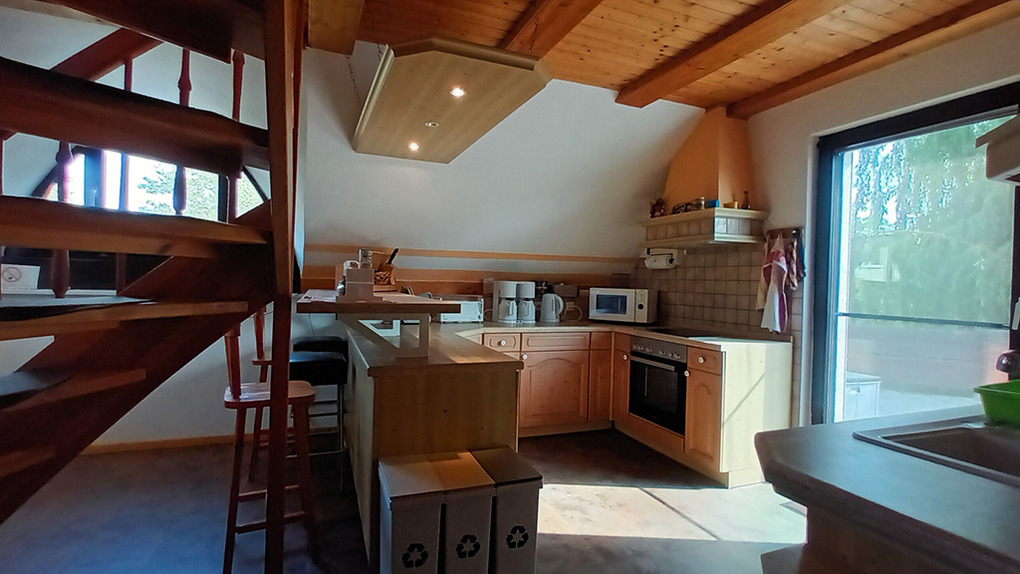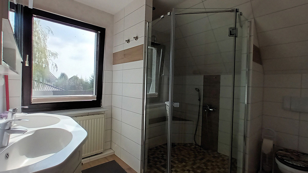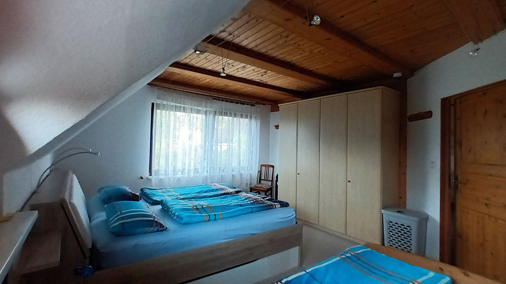 D 134.80 Ferienhaus 4-10 Pers.: Großzügiges 3 ½-Zimmerhaus mit 134 qm Wohnfläche über 3 Etagen. Parterre: Flur mit Garderobe. Gemütlicher Wohnraum mit Couchgarnituren, Sat-TV, Radio/CD. Hauswirtschaftsraum mit Kühlschrank, Waschmaschine, Spülmaschine. Dusche/WC. 1. Etage: Wohnküche mit Esstisch, thekenartig abgetrennter Küchenzeile (Backofen, Mikrowelle, Spülmaschine). 4-Bettzimmer mit 2 Doppelbetten. Bad: großzügige Duschkabine, 2 Wb, WC. 2. Etage mit Dachschrägen: 3-Bettzimmer mit Doppelbett, Einzelbett. Dahinter weiteres 3-Bettzimmer mit Doppelbett, Einzelbett, Kinderbett (1,20 m Länge).