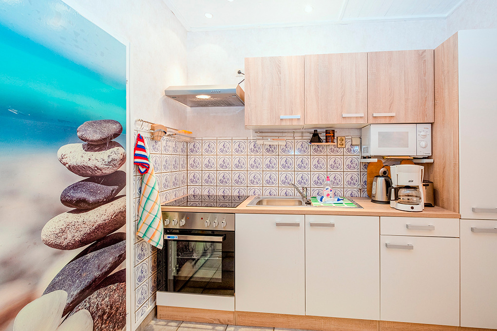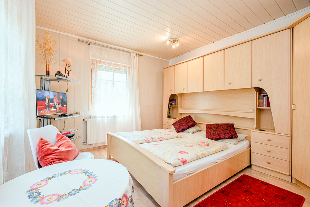 D 134.81 Wohnung 2 Pers.: 1½-Zimmerwohnung mit 28 qm Wohnfläche, Parterre. Wohn-/Schlafraum mit Schlafsofa (1 Pers.), Sat-TV, Doppelbett. Wohnküche mit Esstisch, Radio, kleine Küchenzeile (Backofen). Bad/WC.